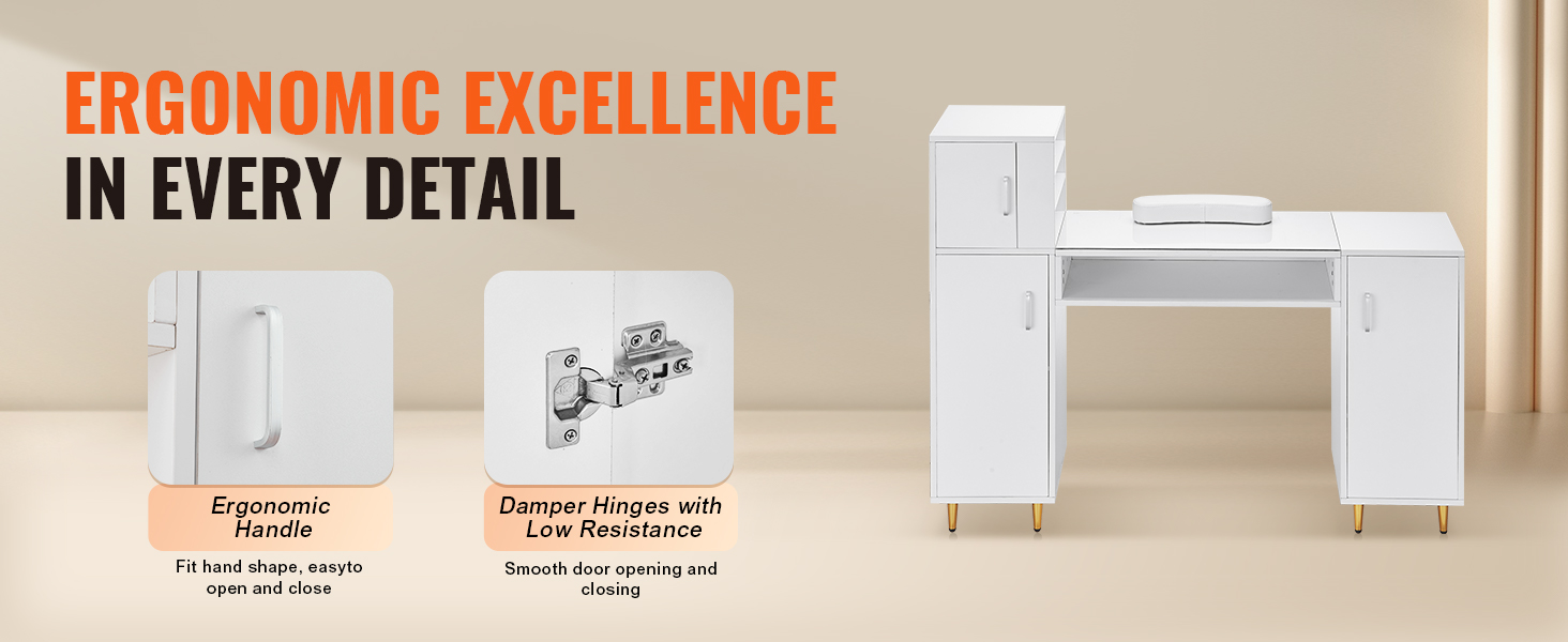 Naša manikúrová stanica, navrhnutá s ohľadom na okolnosti, je vybavená ergonomickou rukoväťou, ktorá umožňuje hladké a bezproblémové otváranie a zatváranie. Vďaka tlmiacim závesom zabezpečuje plynulý chod bez odporu, čím poskytuje pohodlný a príjemný používateľský zážitok.