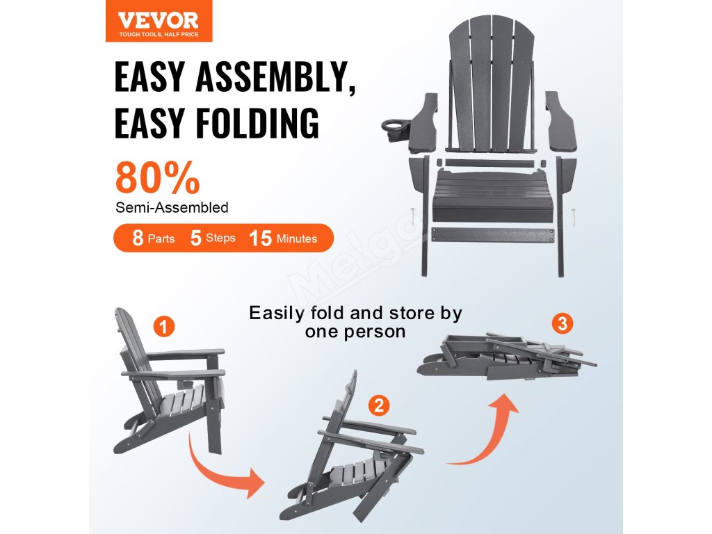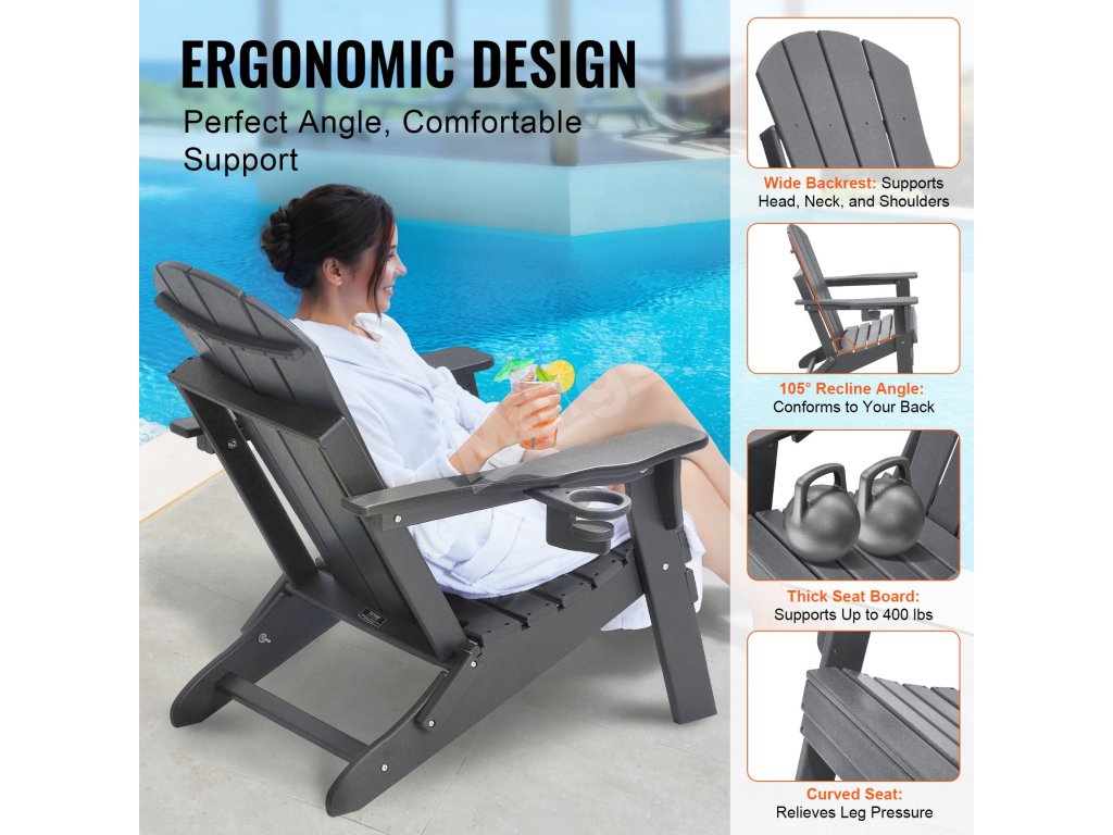 Naše kreslo Adirondack má skladací dizajn na jednoduché skladovanie. Montáž je rýchla a trvá len 15 minút pomocou elektrického skrutkovača. Je vyrobené z plastu HDPE, unesie až 400 kg a odolá slnku, dažďu aj vetru. Ideálne na terasy, záhrady a pláže.
