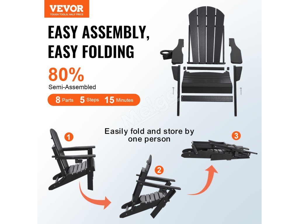 Toto kreslo sa zostaví len za 15 minút a má skladací dizajn na jednoduché skladovanie. Je vyrobená z vysokokvalitného plastu HDPE a je odolná na dlhodobé používanie v exteriéri.