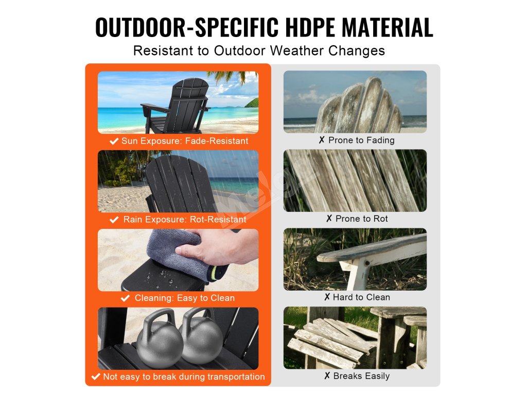 Naše kreslo Adirondack má skladací dizajn na jednoduché skladovanie. Montáž je rýchla a trvá len 15 minút pomocou elektrického skrutkovača. Je vyrobené z plastu HDPE, unesie až 400 kg a odolá slnku, dažďu aj vetru. Ideálne na terasy, záhrady a pláže.