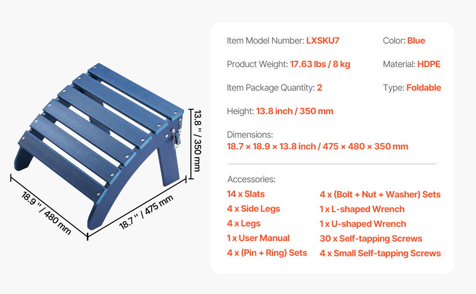 Otoman Adirondack je vyrobený z odolného materiálu HDPE so skrutkami z nehrdzavejúcej ocele 304 odolnými voči korózii. Je skladací na jednoduché skladovanie, inštaluje sa v 4 krokoch a má pohodlnú výšku 13,8 palca s uhlom 43 stupňov. Ideálny na rôzne vonkajšie prostredie.