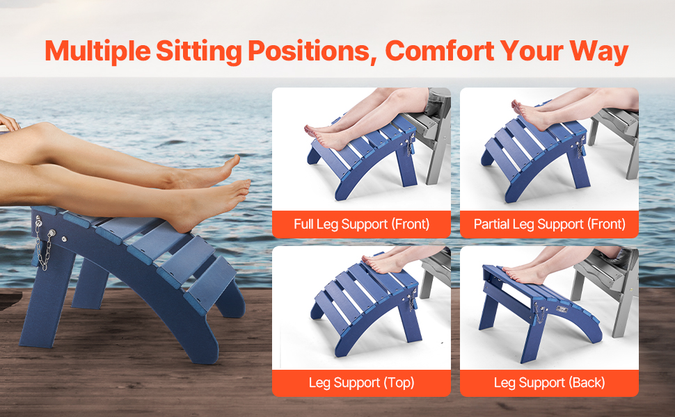 Naša stolička na nohy Adirondack poskytuje rôzne možnosti sedenia a poskytuje pohodlnú oporu pre nohy. Vďaka nastaviteľným polohám si ľahko nájdete pohodlnú polohu, aby ste si mohli vychutnať relaxáciu v prírode.