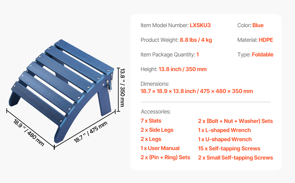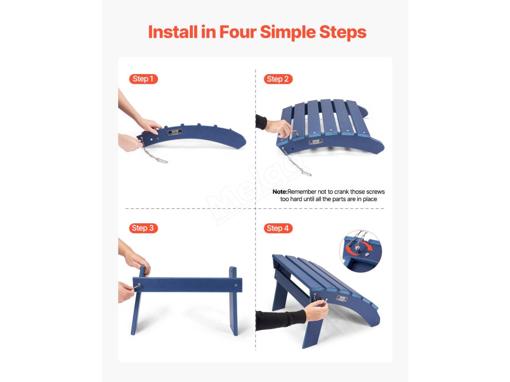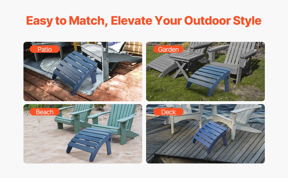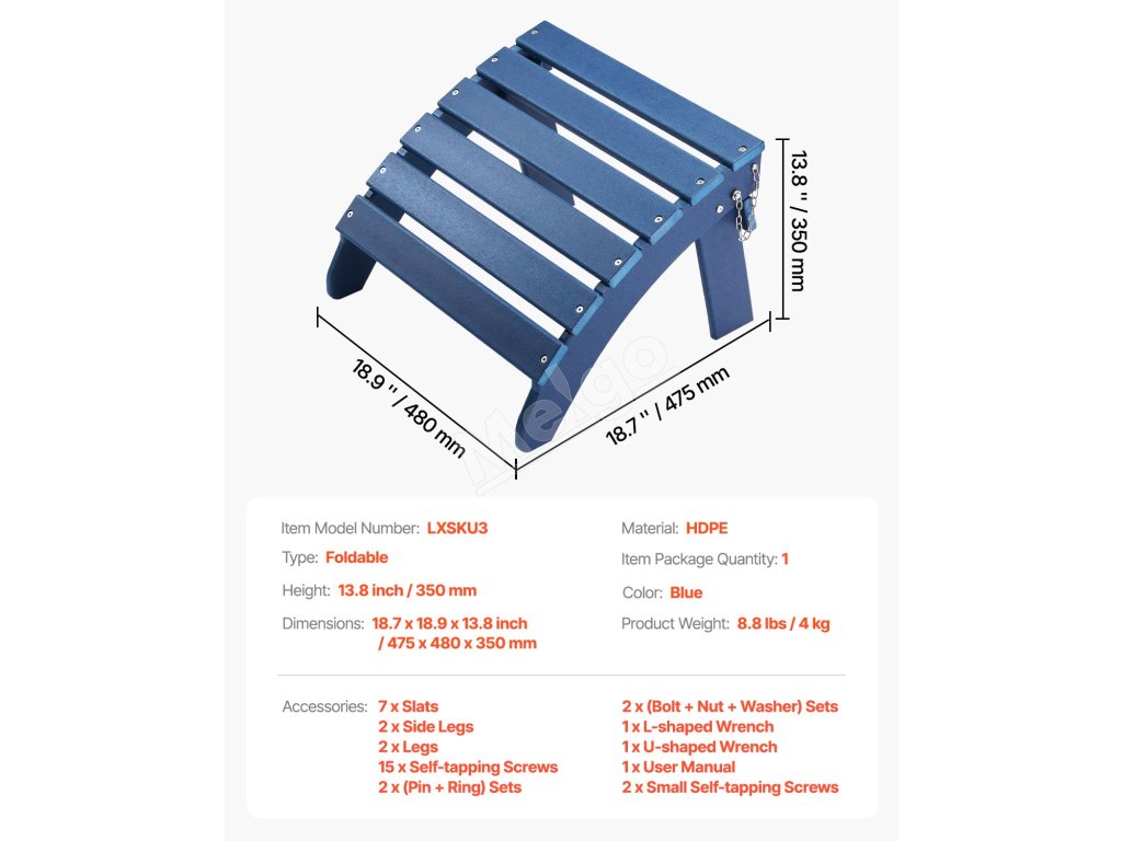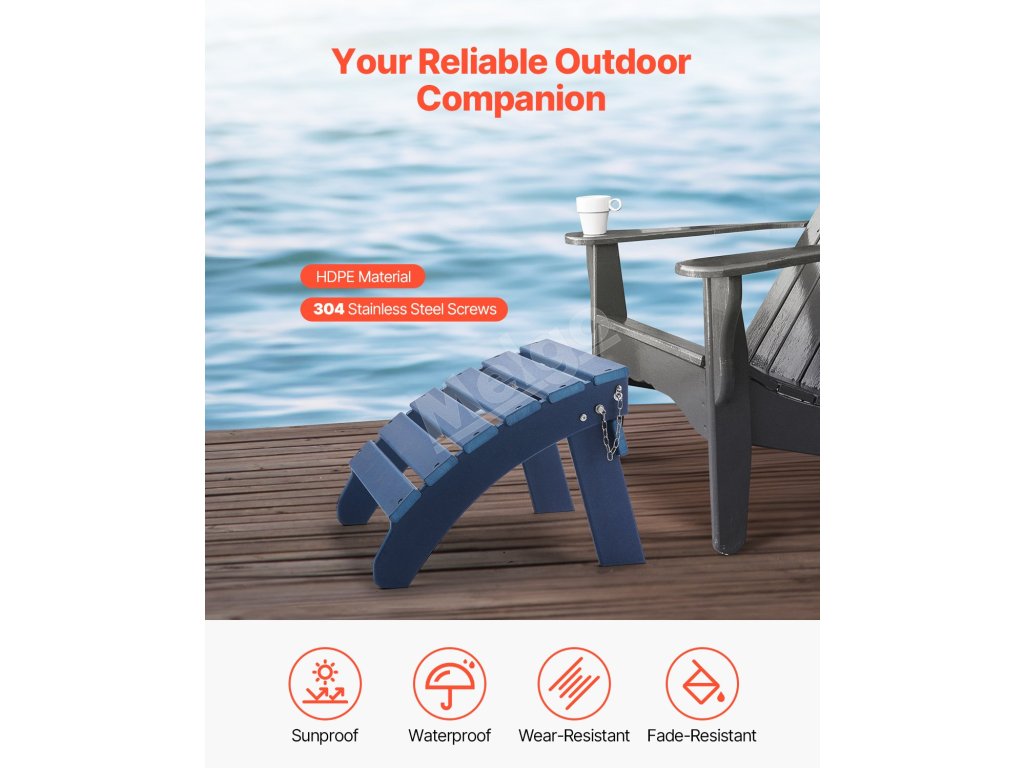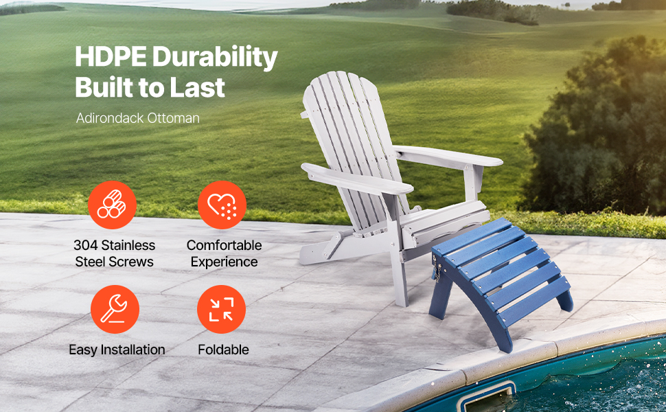 Otoman Adirondack je vyrobený z odolného materiálu HDPE so skrutkami z nehrdzavejúcej ocele 304 odolnými voči korózii. Je skladací na jednoduché skladovanie, inštaluje sa v 4 krokoch a má pohodlnú výšku 13,8 palca s uhlom 43 stupňov. Ideálny na rôzne vonkajšie prostredie.