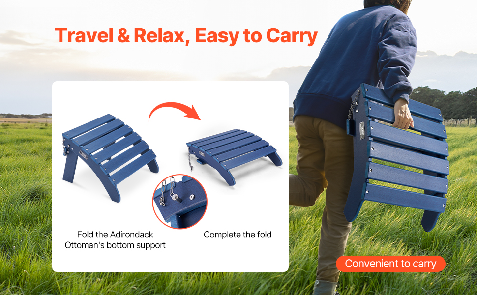 Konštrukcia našej podnožky Adirondack umožňuje jednoduché zloženie. Jednoducho zložte spodnú opierku na rýchle uskladnenie, vďaka čomu ju môžete ľahko prenášať, či už sa chystáte na pláž alebo relaxovať v kempe.