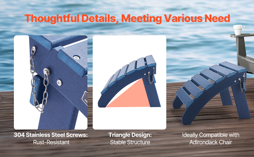 Skladacia podnožka Adirondack ideálne ladí so stoličkou Adirondack a používa skrutky z nehrdzavejúcej ocele 304, ktoré chránia pred hrdzou. Trojuholníková konštrukcia zvyšuje stabilitu a poskytuje bezpečnejší a pohodlnejší zážitok.