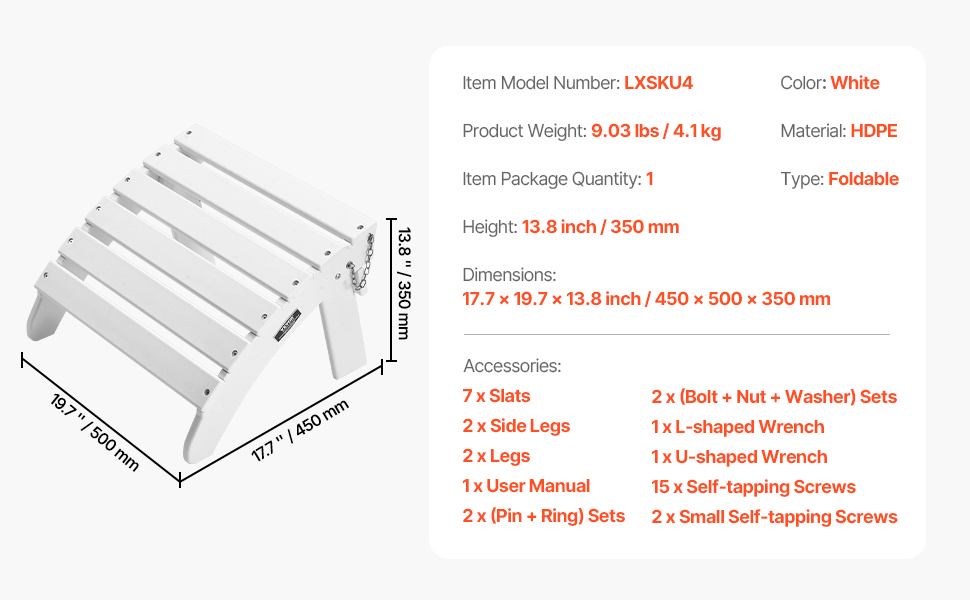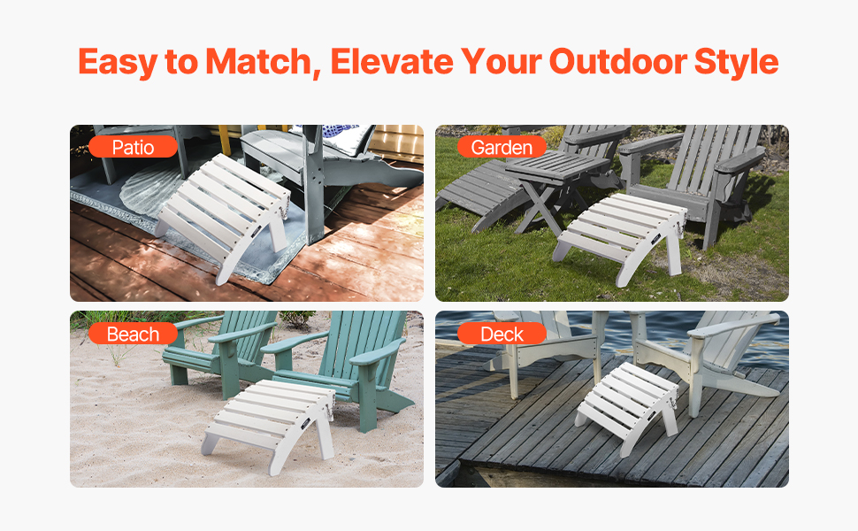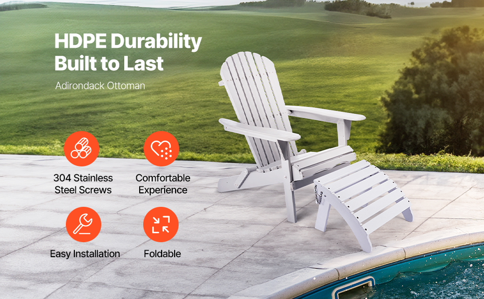 Otoman Adirondack je vyrobený z odolného materiálu HDPE so skrutkami z nehrdzavejúcej ocele 304 odolnými voči korózii. Je skladací na jednoduché skladovanie, inštaluje sa v 4 krokoch a má pohodlnú výšku 13,8 palca s uhlom 43 stupňov. Ideálny na rôzne vonkajšie prostredie.