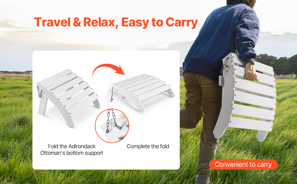 Konštrukcia našej podnožky Adirondack umožňuje jednoduché zloženie. Jednoducho zložte spodnú opierku na rýchle uskladnenie, vďaka čomu ju môžete ľahko prenášať, či už sa chystáte na pláž alebo relaxovať v kempe.