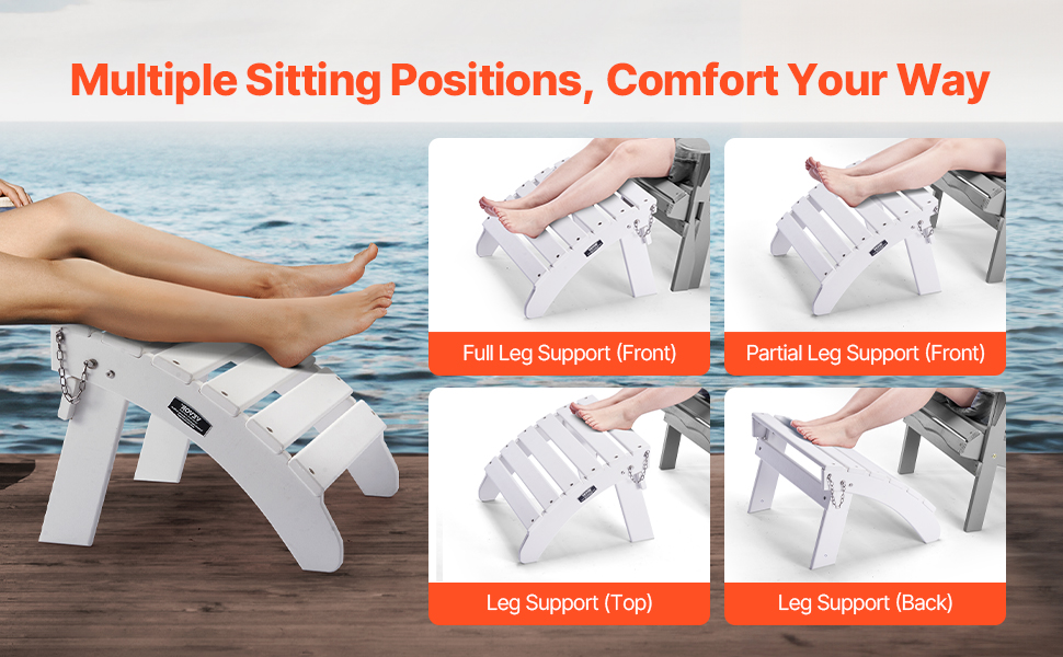 Naša stolička na nohy Adirondack poskytuje rôzne možnosti sedenia a poskytuje pohodlnú oporu pre nohy. Vďaka nastaviteľným polohám si ľahko nájdete pohodlnú polohu, aby ste si mohli vychutnať relaxáciu v prírode.