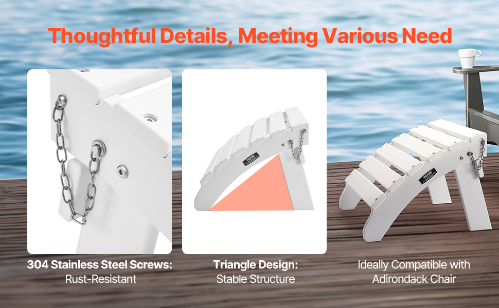 Skladacia podnožka Adirondack ideálne ladí so stoličkou Adirondack a používa skrutky z nehrdzavejúcej ocele 304, ktoré chránia pred hrdzou. Trojuholníková konštrukcia zvyšuje stabilitu a poskytuje bezpečnejší a pohodlnejší zážitok.