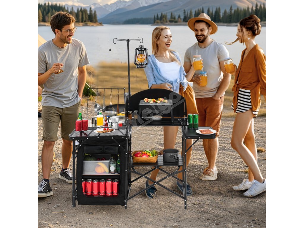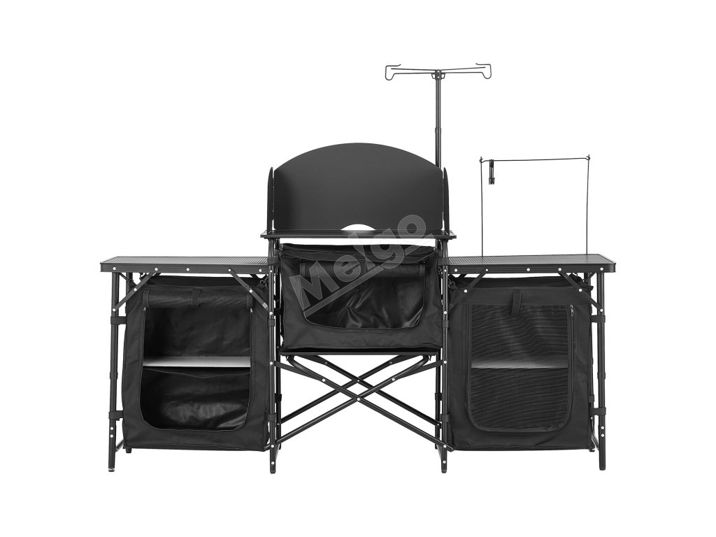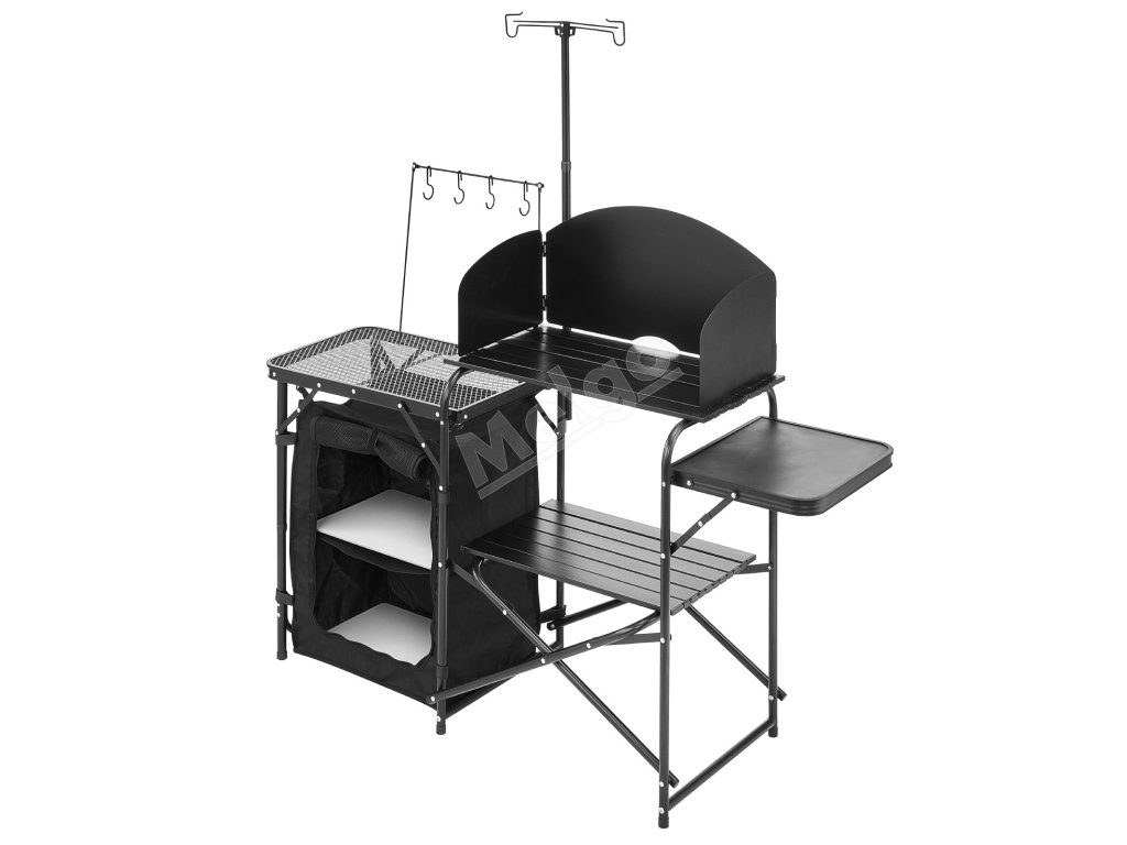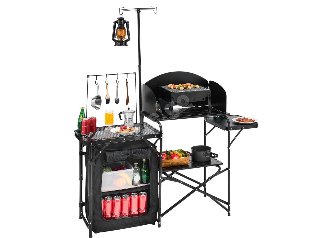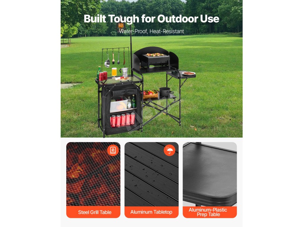 Otázka č. 1: Odolá kempingový kuchynský stôl vonkajším poveternostným podmienkam?" A1: Použité materiály sú odolné voči vode a teplu. Keď však stôl nepoužívate, odporúčame ho uložiť do prenosnej tašky alebo na suché miesto, aby sa predĺžila jeho životnosť. 2. otázka: Čo môžem uložiť do úložných priehradiek? 2. otázka: Úložné priehradky sú vhodné na náčinie, kuchynský riad, prísady alebo malé kuchynské spotrebiče, ako napríklad sporák. Otázka č. 3: Aké materiály sú použité v konštrukcii?A3: Rám: Stolová doska: Oceľový rám pre ľahkú odolnosť: Odkladací priestor: Hliník, hliník-plast a oceľ s povrchom odolným voči poškriabaniu a ľahko čistiteľným: Oddelenia: Odolná tkanina 600D oxford odolná voči poveternostným vplyvom.