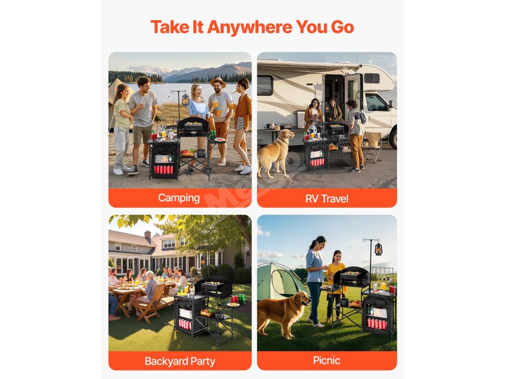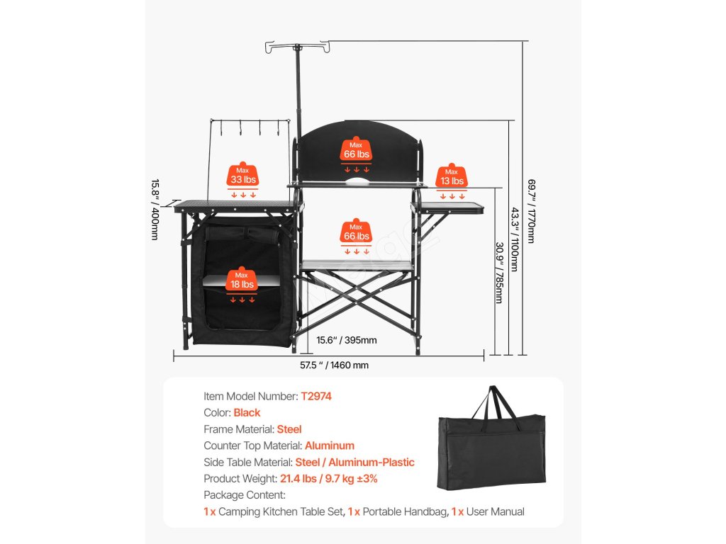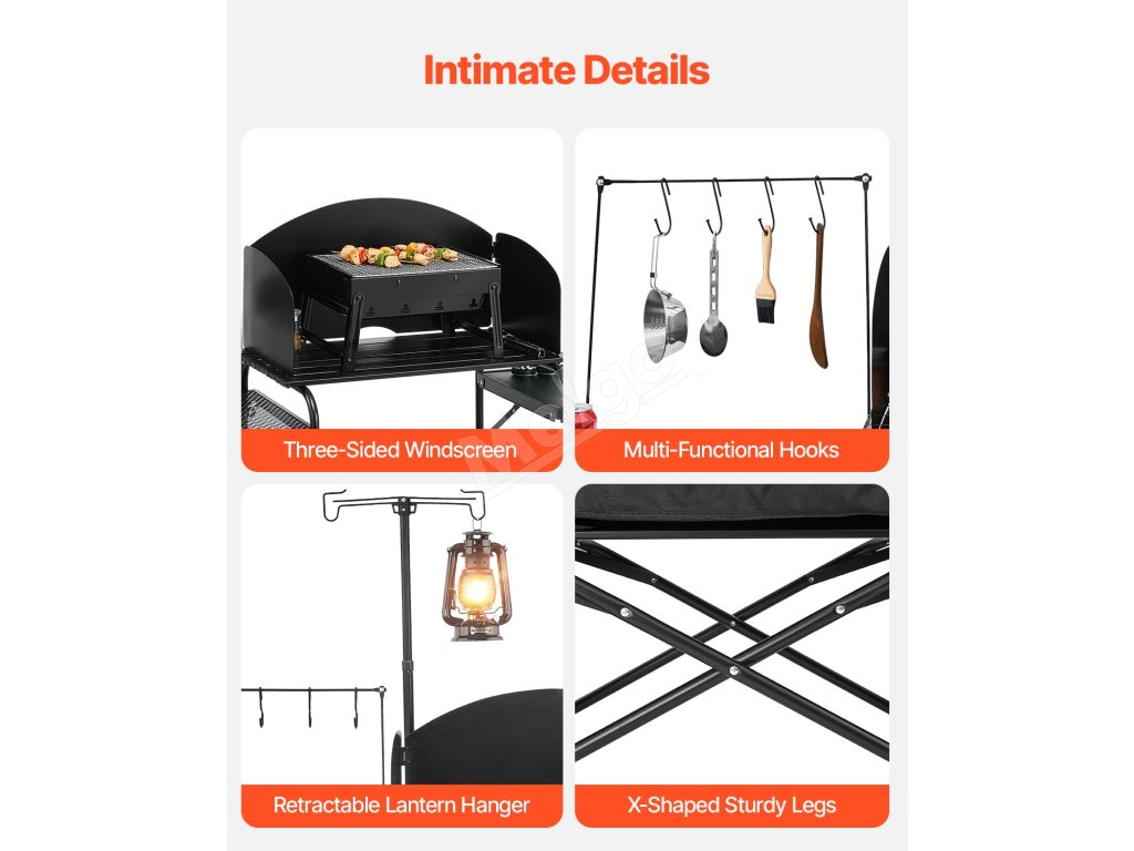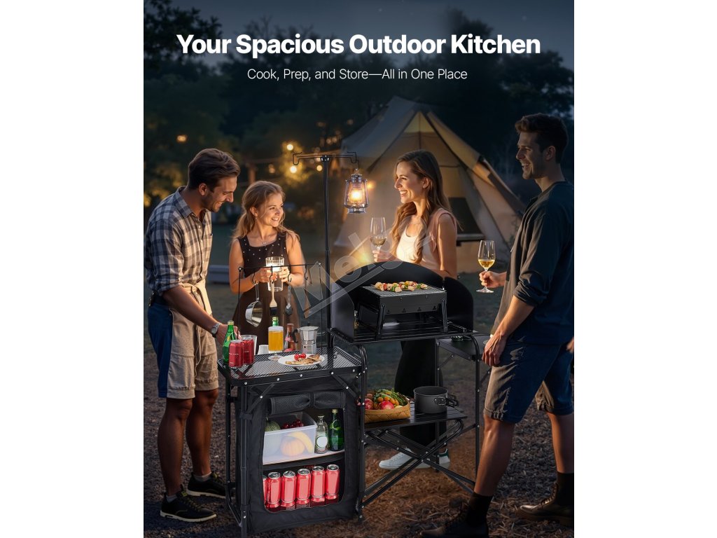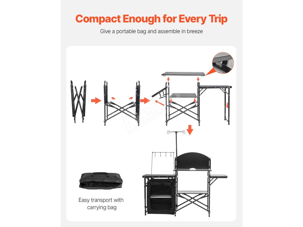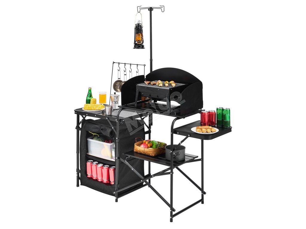 Otázka č. 1: Odolá kempingový kuchynský stôl vonkajším poveternostným podmienkam?" A1: Použité materiály sú odolné voči vode a teplu. Keď však stôl nepoužívate, odporúčame ho uložiť do prenosnej tašky alebo na suché miesto, aby sa predĺžila jeho životnosť. 2. otázka: Čo môžem uložiť do úložných priehradiek? 2. otázka: Úložné priehradky sú vhodné na náčinie, kuchynský riad, prísady alebo malé kuchynské spotrebiče, ako napríklad sporák. Otázka č. 3: Aké materiály sú použité v konštrukcii?A3: Rám: Stolová doska: Oceľový rám pre ľahkú odolnosť: Odkladací priestor: Hliník, hliník-plast a oceľ s povrchom odolným voči poškriabaniu a ľahko čistiteľným: Oddelenia: Odolná tkanina 600D oxford odolná voči poveternostným vplyvom.
