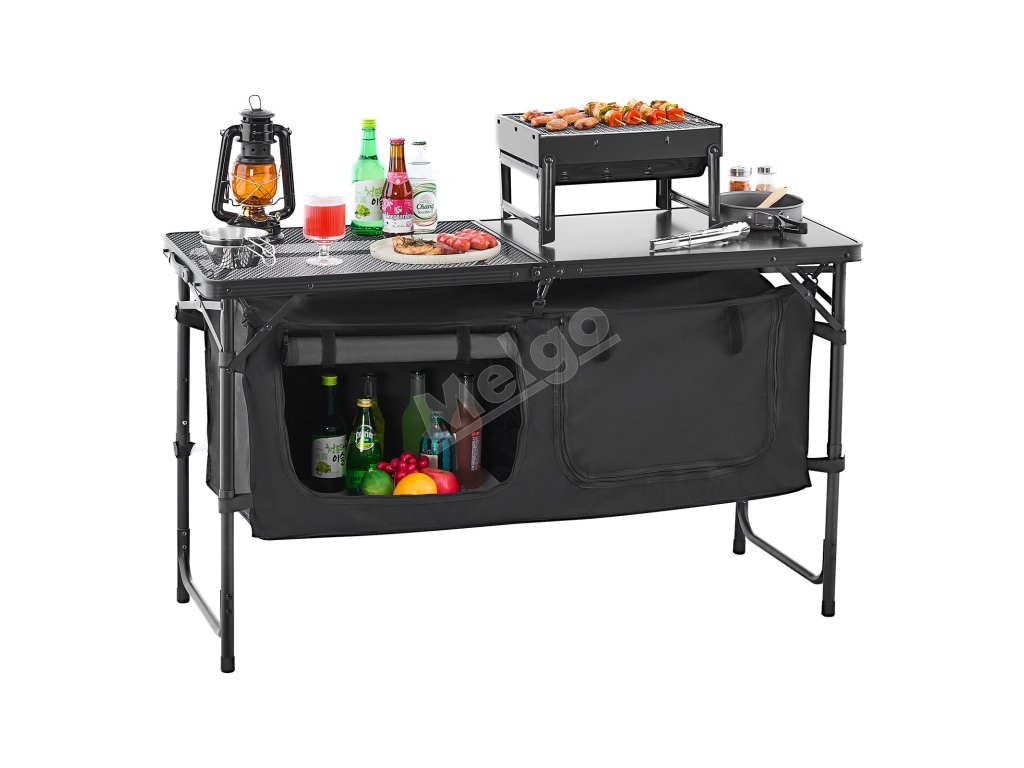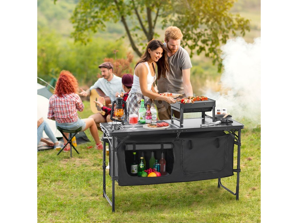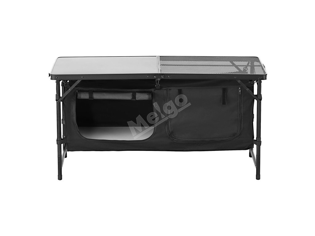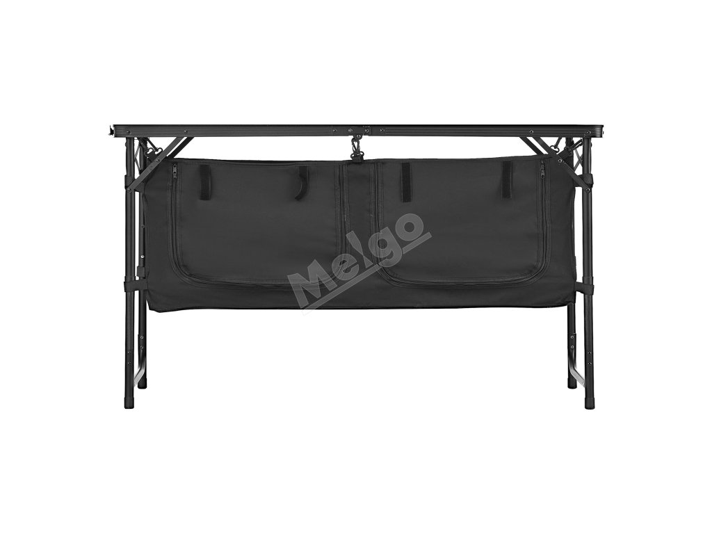 Skladací kempingový kuchynský stôl, hliník, 3 výšky, organizér, čierny