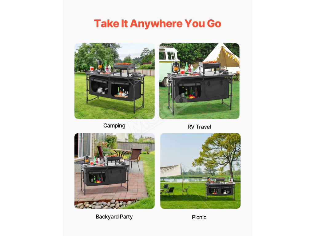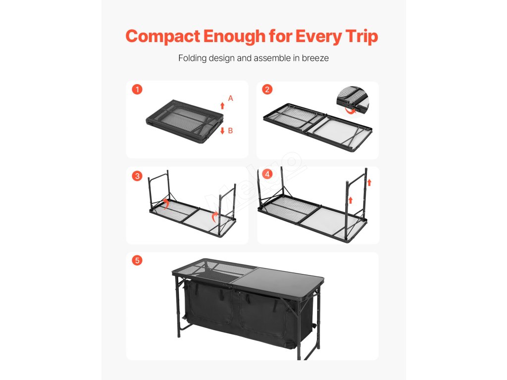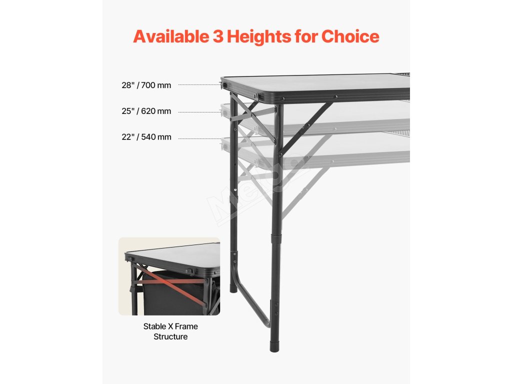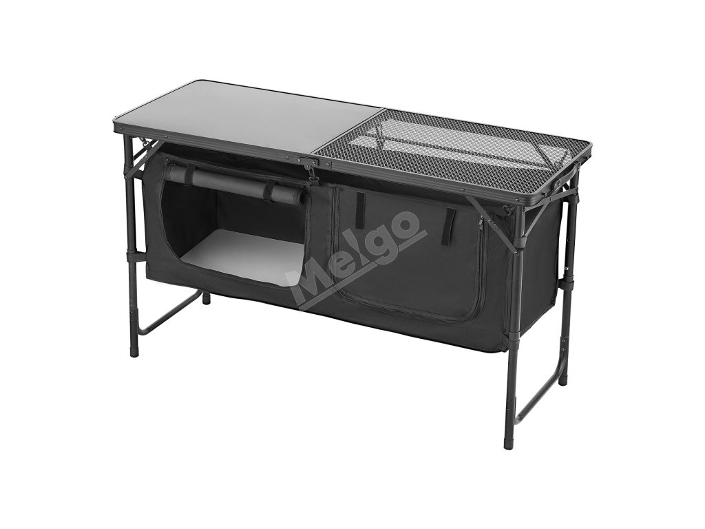 Skladací kempingový kuchynský stôl, hliník, 3 výšky, organizér, čierny