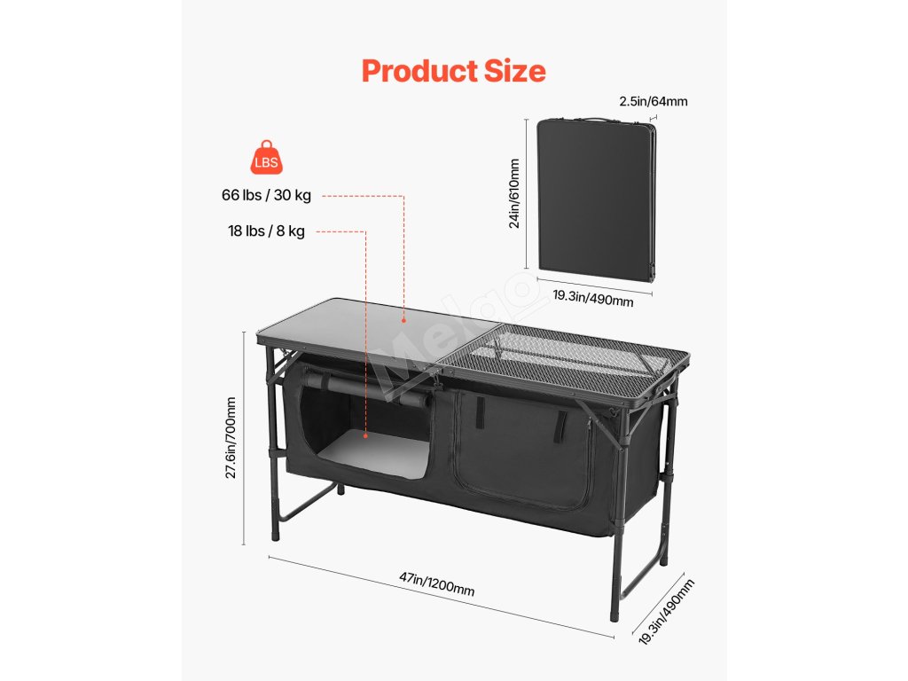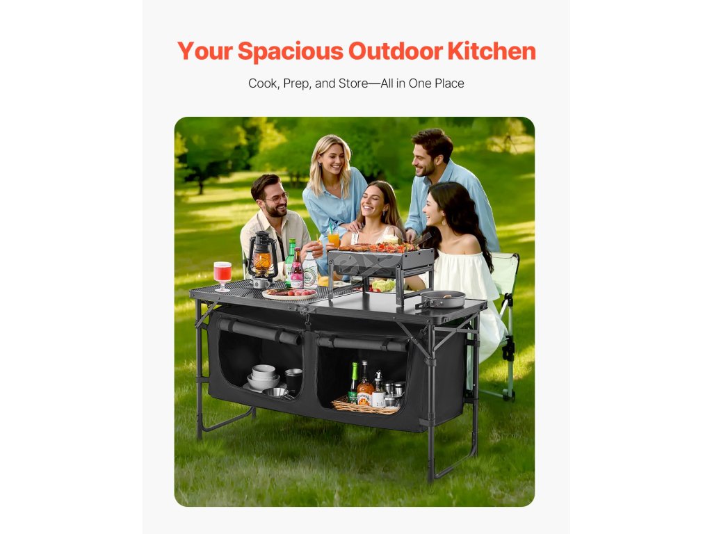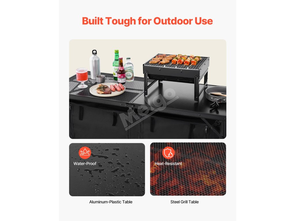 Otázka č. 1: Odolá kempingový kuchynský stôl vonkajším poveternostným podmienkam?" A1: Použité materiály sú odolné voči vode a teplu. Keď však stôl nepoužívate, odporúčame ho uložiť do prenosnej tašky alebo na suché miesto, aby sa predĺžila jeho životnosť. 2. otázka: Čo môžem uložiť do úložných priehradiek? 2. otázka: Úložné priehradky sú vhodné na náčinie, kuchynský riad, prísady alebo malé kuchynské spotrebiče, ako sú napríklad sporáky. Otázka č. 3: Aké materiály sú použité v konštrukcii?A3: Rám: Stolová doska: Rám z hliníkovej zliatiny pre ľahkú odolnosť: Hliníkovo-plastová a oceľová doska s povrchom odolným voči poškriabaniu a ľahko čistiteľným: Oddelenia z tkaniny oxford 600D: Odolné a odolné voči poveternostným vplyvom.