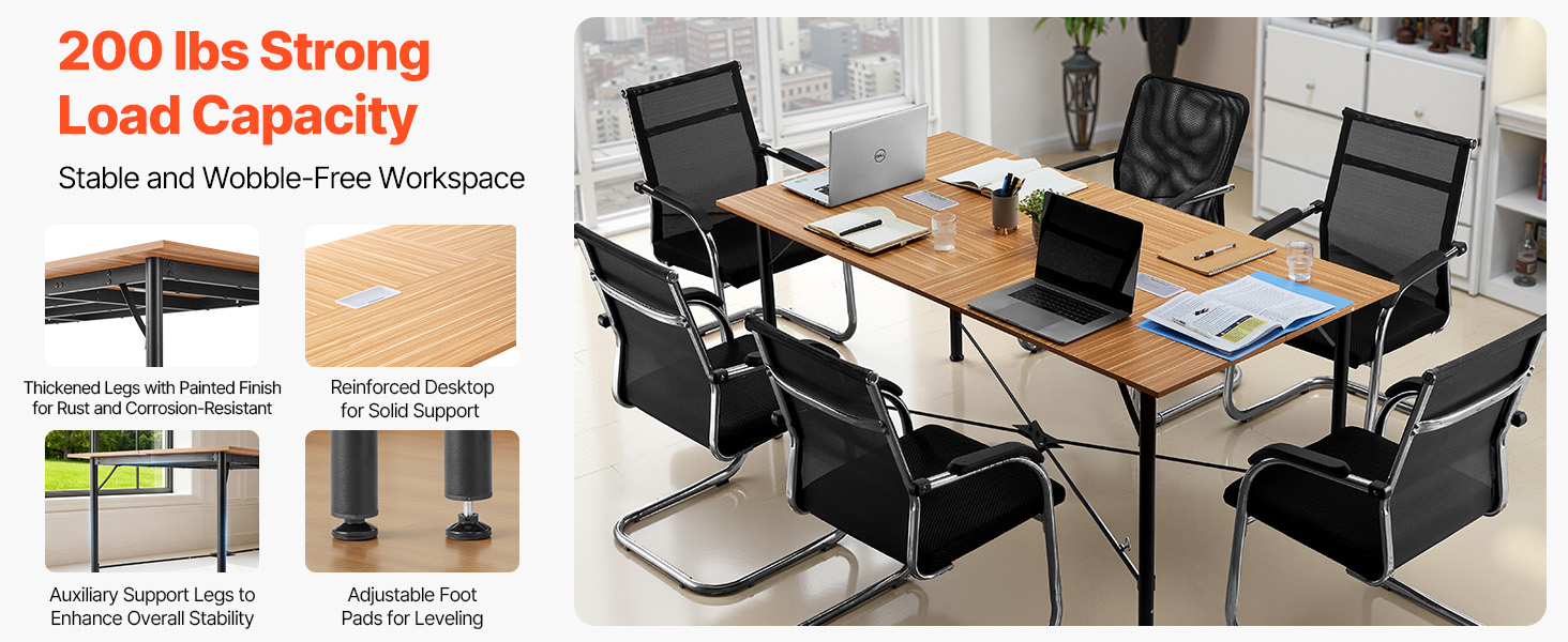Tento konferenčný stôl, skonštruovaný so zosilnenou stolovou doskou a zosilnenými kovovými nohami, poskytuje vynikajúcu podporu hmotnosti. Pomocné oporné nohy a nastaviteľné podložky pod nohy ho udržiavajú stabilný a nekolísavý, čo zaručuje bezpečné používanie pri rušných stretnutiach.