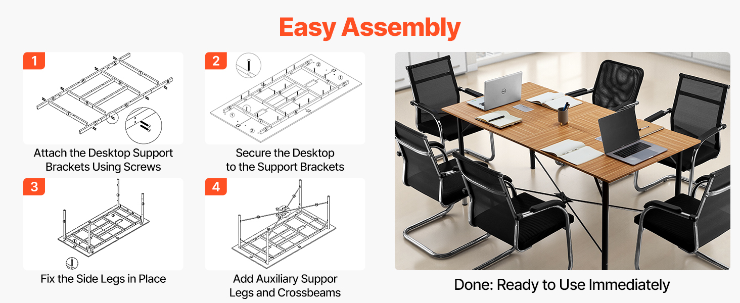 Kancelársky konferenčný stôl sa dodáva so všetkými skrutkami, kľúčom a skrutkovačom, ako aj s podrobnou používateľskou príručkou, ktorá slúži ako návod. Nie je potrebné žiadne ďalšie náradie - môžete ho bez námahy zostaviť a ihneď nastaviť, čím ušetríte čas a energiu.