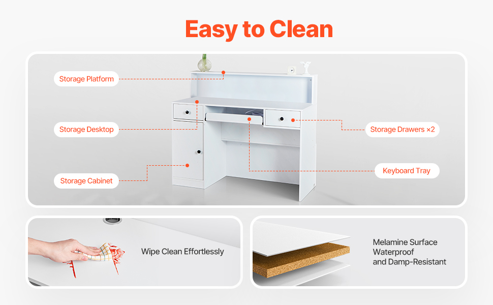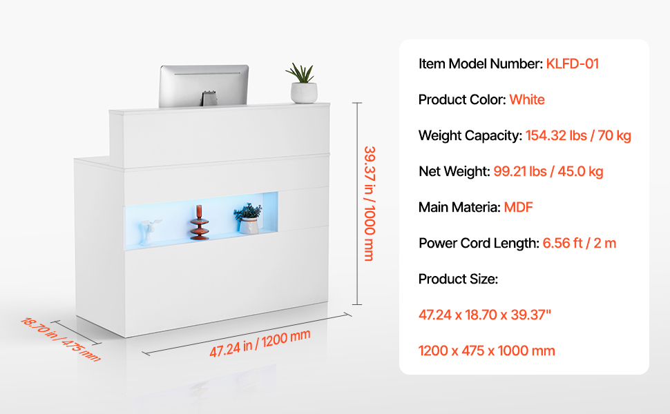 Tento recepčný stôl je z odolnej MDF dosky s hladkým, vodeodolným povrchom. Je vybavený výsuvom na klávesnicu, 2 zásuvkami a úložnou skrinkou, ktoré poskytujú dostatok priestoru. Je ideálny do komerčných priestorov a má elektrické zásuvky, porty USB a svetelný pás LED. Ľahko sa zostavuje pomocou návodu.