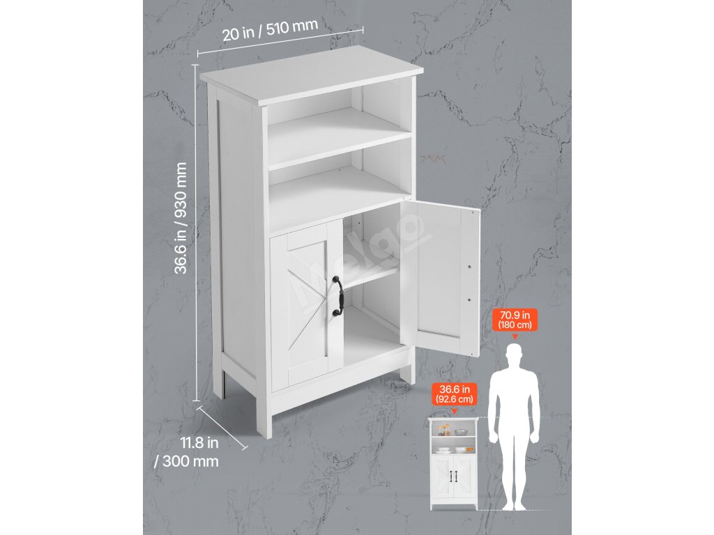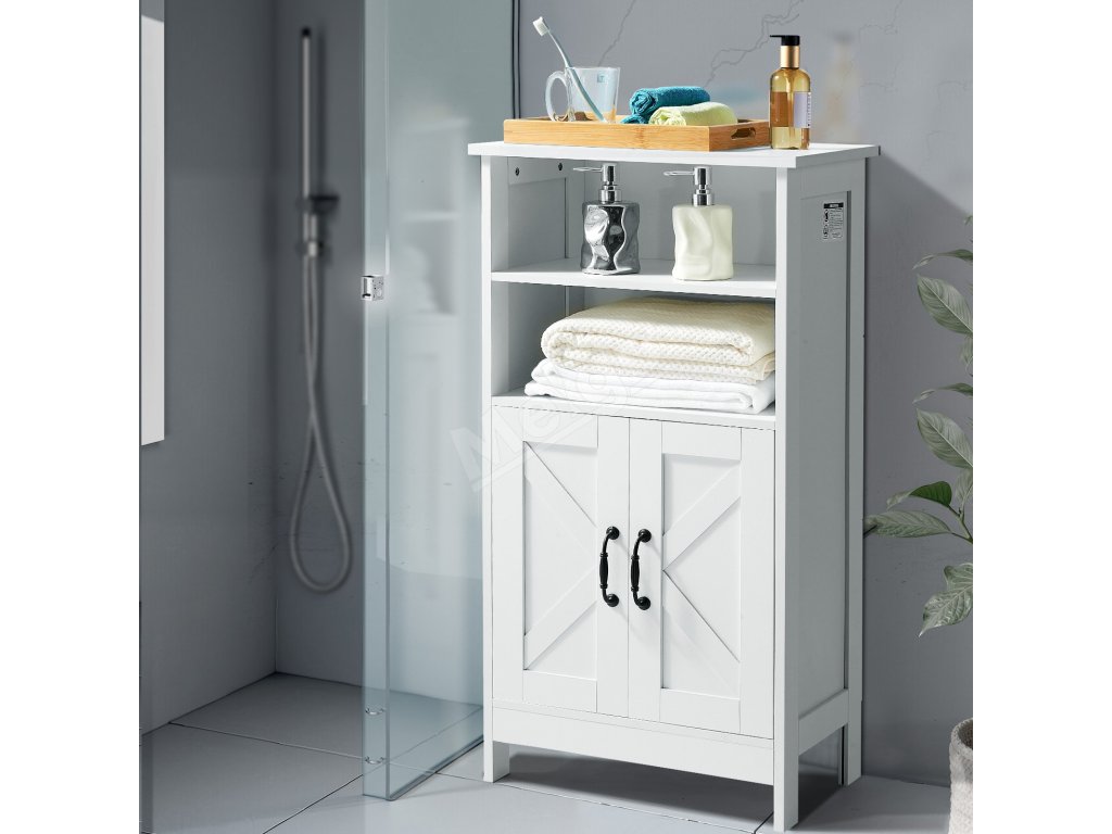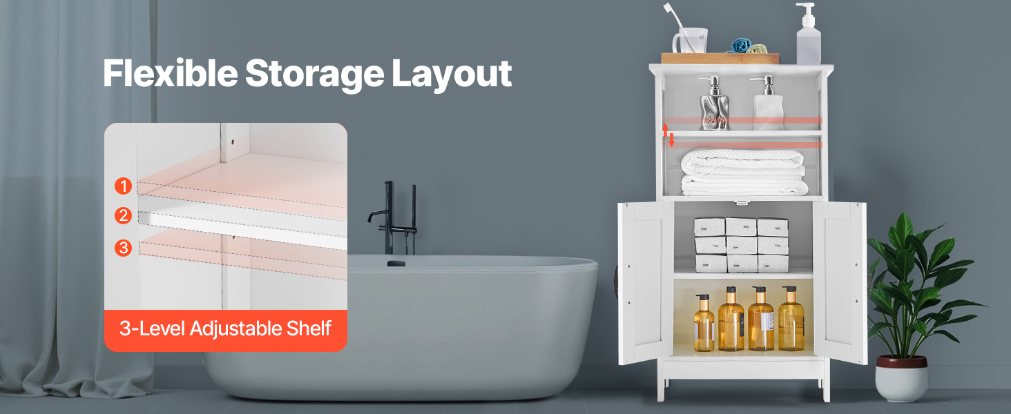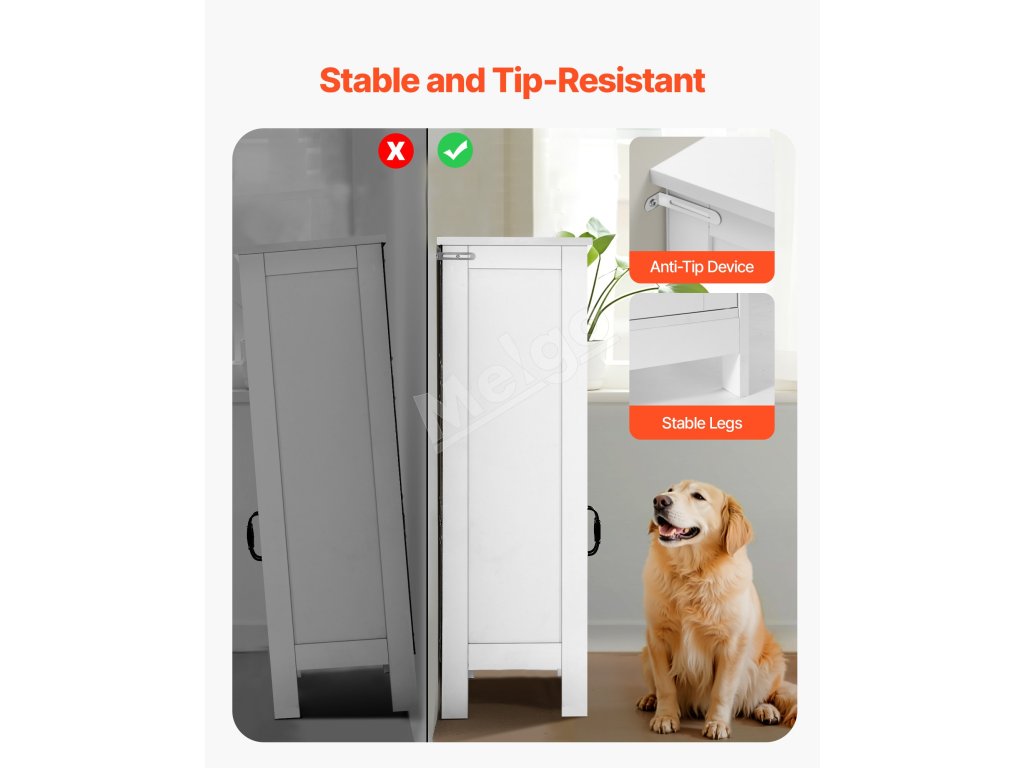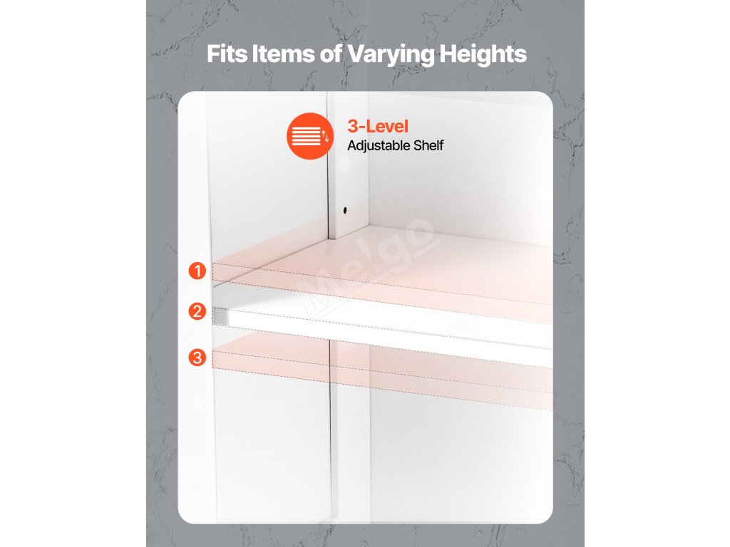 Prednastavené otvory na poličky umožňujú jednoduché nastavenie výšky pomocou 3 úrovní, do ktorých sa zmestia rôzne predmety, ako sú mydelničky, prípravky na starostlivosť o pleť, pracie prostriedky, koše na uteráky a ďalšie. Tento dizajn výrazne zvyšuje funkčnosť našej podlahovej úložnej skrinky do kúpeľne.