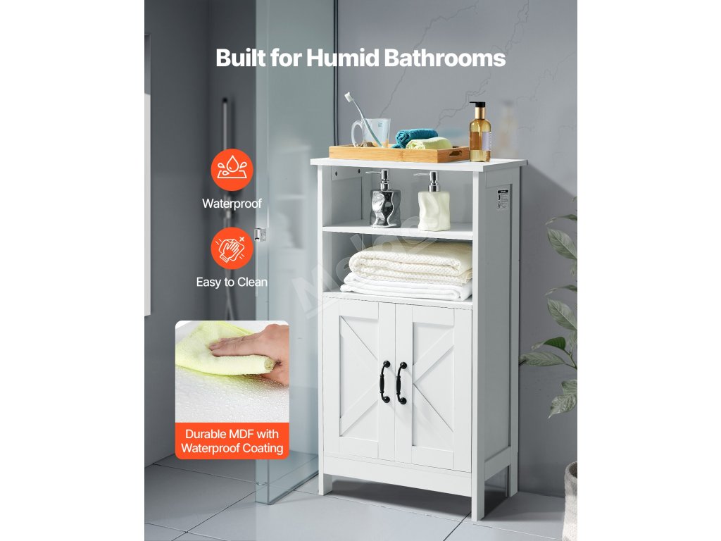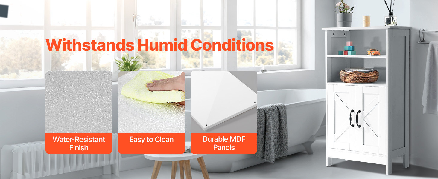 Táto biela kúpeľňová skrinka, vyrobená z prvotriednej MDF dosky P2, je potiahnutá vodoodolnou vrstvou, aby odolala vlhkému prostrediu kúpeľne. Vďaka rovnomernej hustote a pevnej vnútornej štruktúre je MDF pevnejšia a stabilnejšia ako bežné drevo alebo plast, čo zabezpečuje odolnosť bez deformácie alebo praskania.