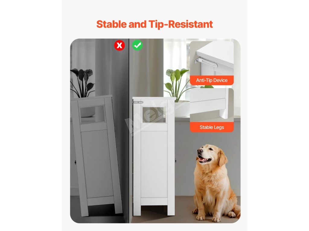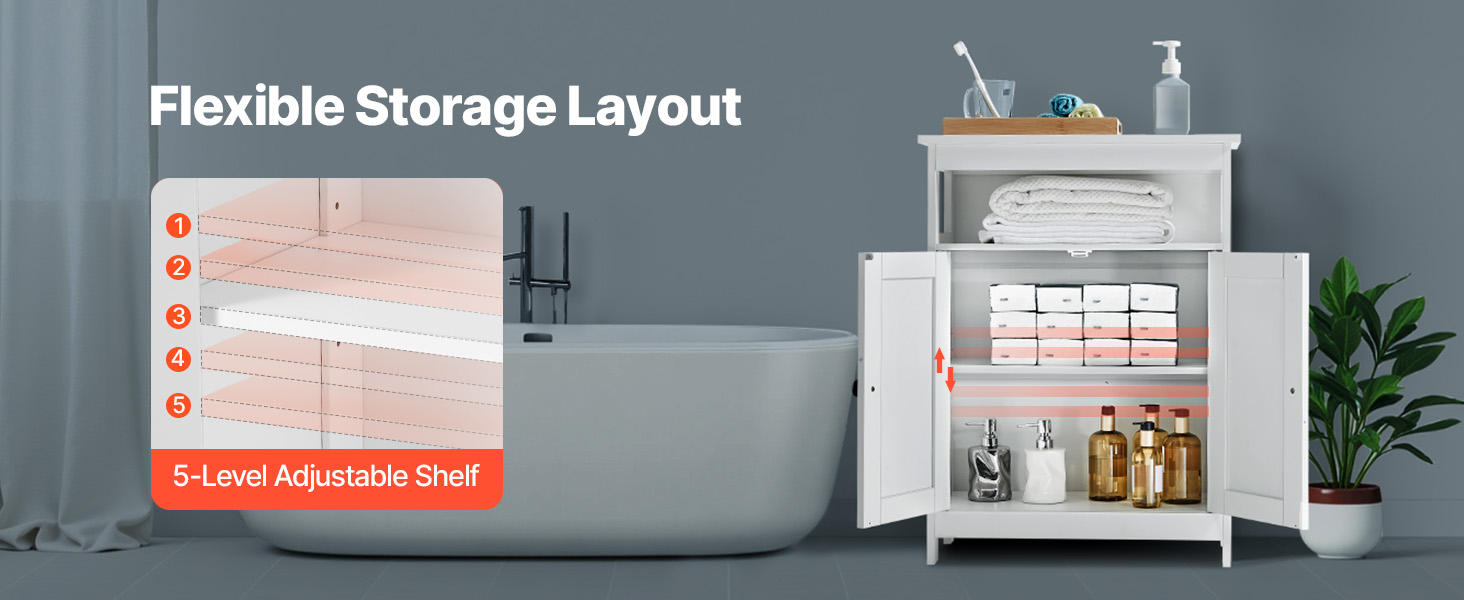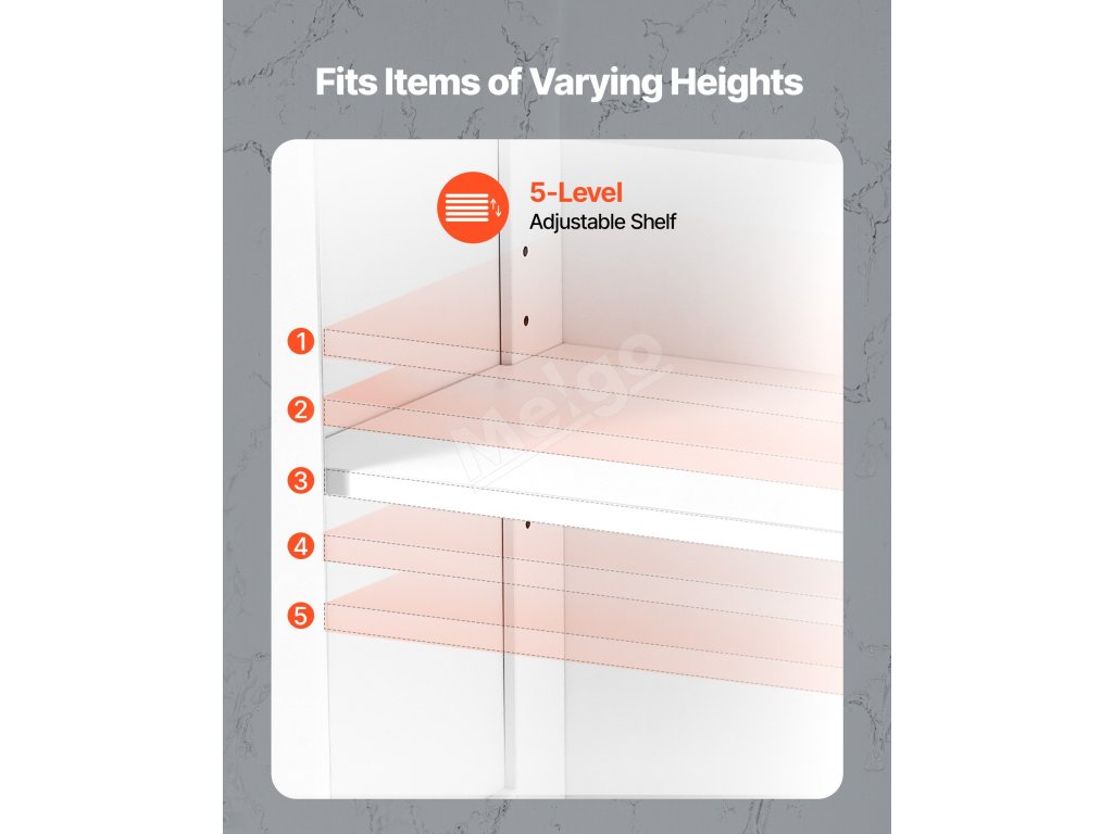 Prednastavené otvory na poličky umožňujú jednoduché nastavenie výšky pomocou 5 úrovní, do ktorých sa zmestia rôzne predmety, ako sú mydelničky, prípravky na starostlivosť o pleť, pracie prostriedky, koše na uteráky a ďalšie. Tento dizajn výrazne zvyšuje funkčnosť našej podlahovej úložnej skrinky do kúpeľne.