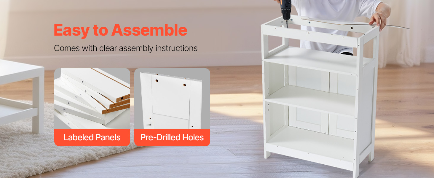 Voľne stojaca kúpeľňová skrinka sa dodáva so všetkým potrebným príslušenstvom a predvŕtanými otvormi, pričom každý diel je jasne očíslovaný, aby bola montáž jednoduchá a prehľadná.
