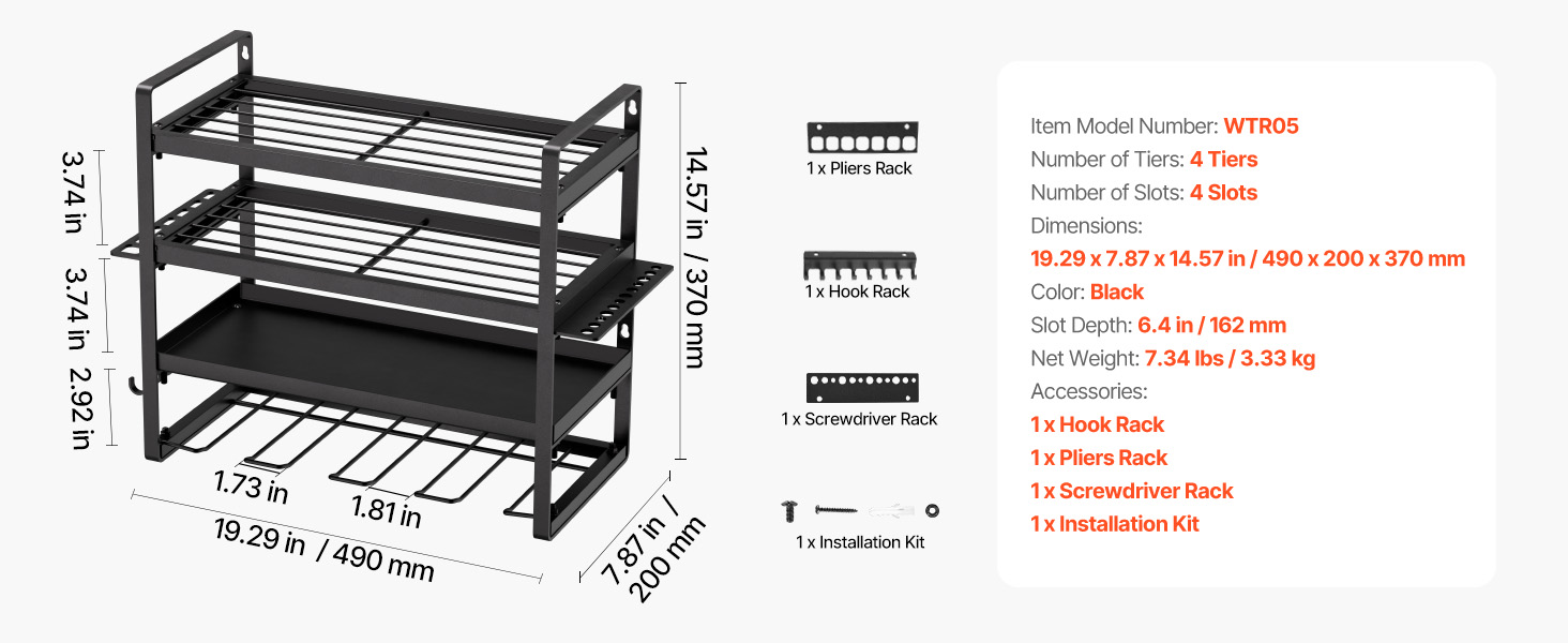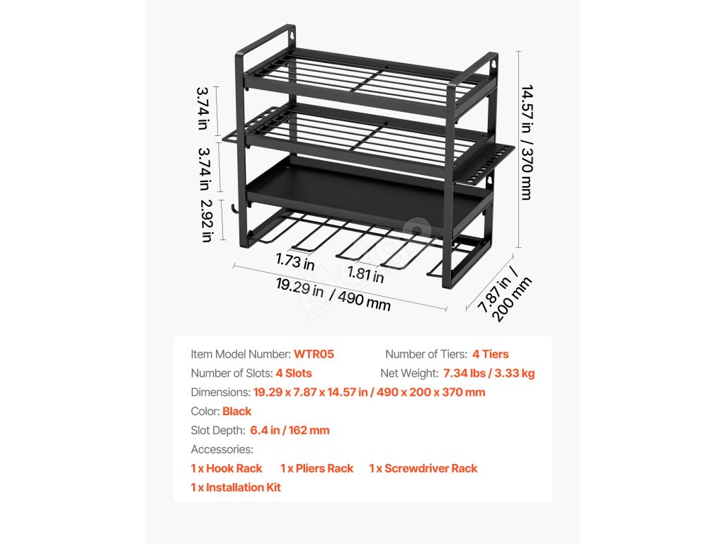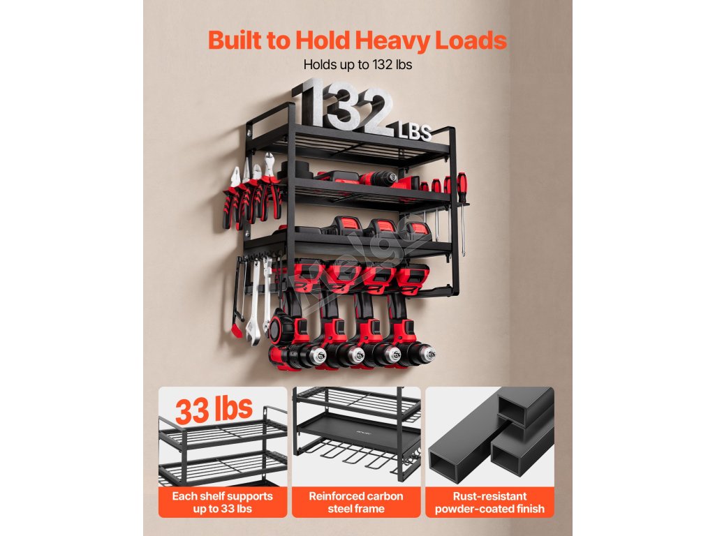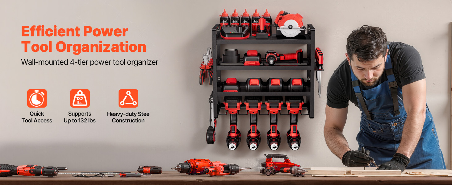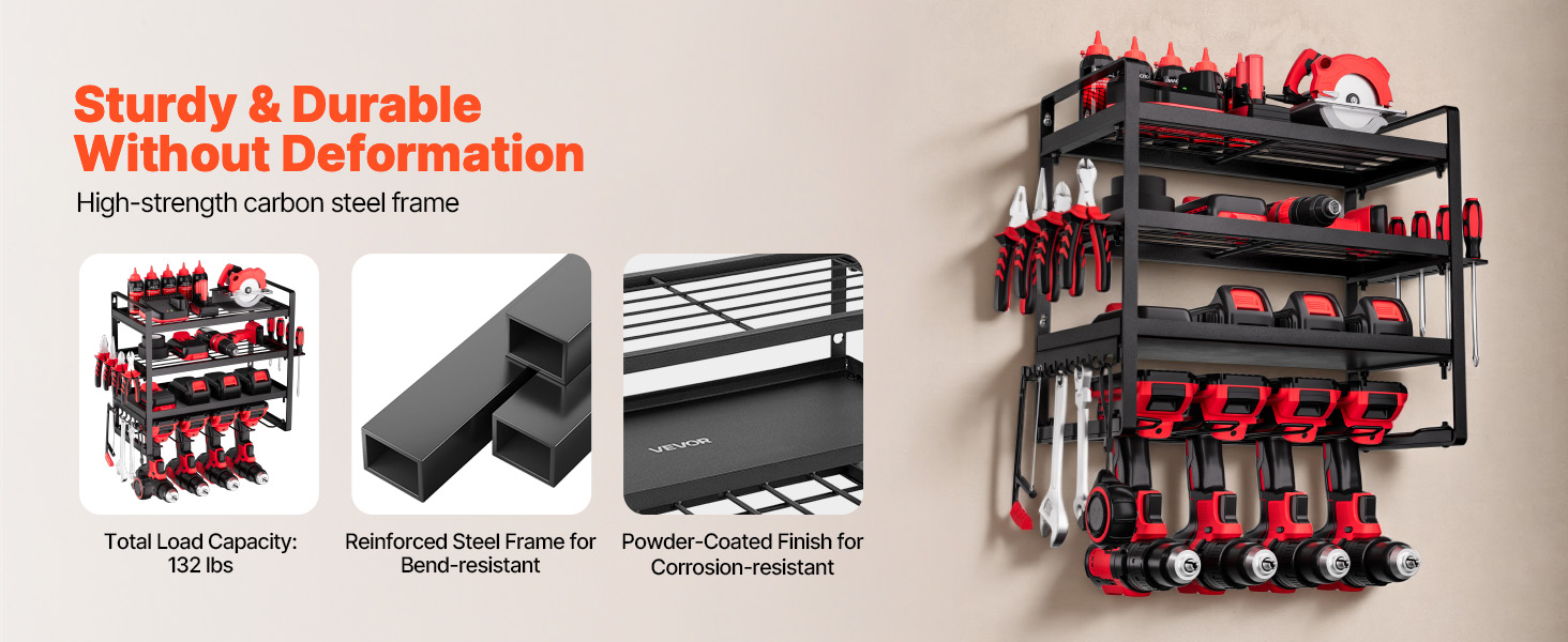 Tento nástenný 4-úrovňový organizér na elektrické náradie ponúka rýchly prístup k náradiu. Jeho robustný rám z uhlíkovej ocele unesie až 132 kg, čo uľahčuje ukladanie vŕtačiek, skríň s náradím a ďalších nástrojov pre uprataný pracovný priestor bez starostí.