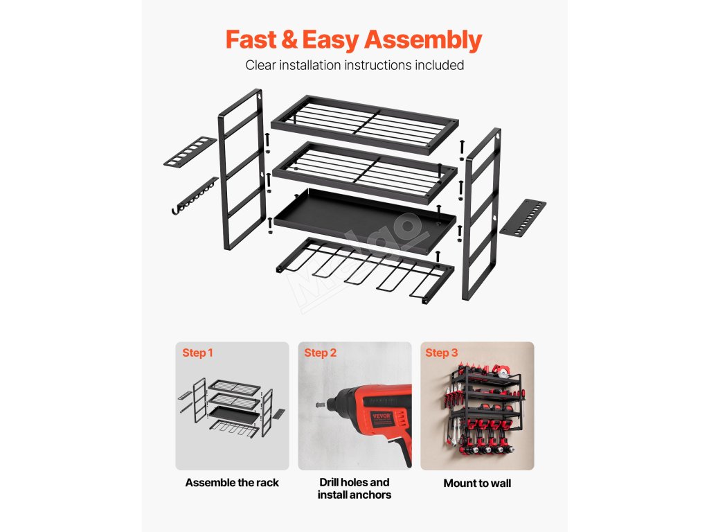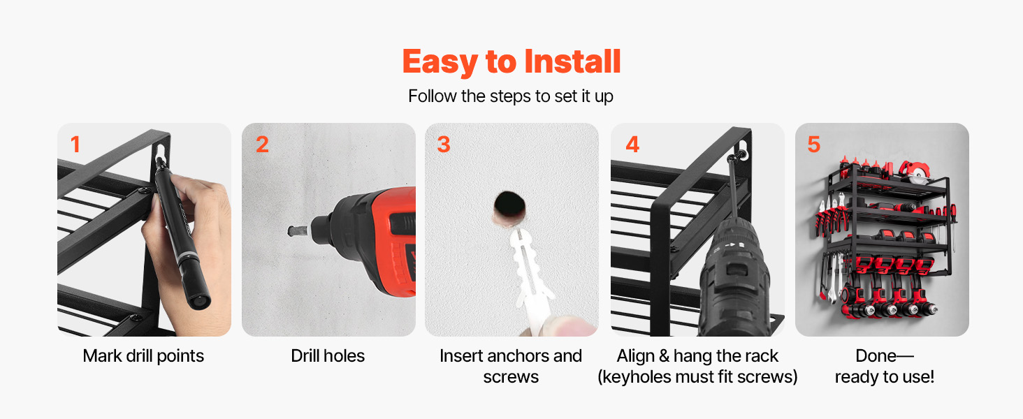 Náš organizér na vŕtačky sa dodáva s jasným návodom krok za krokom a všetkým potrebným hardvérom vrátane rozpernej skrutky na rýchlu a jednoduchú montáž na stenu. Takže ho môžete bez problémov nastaviť v priebehu niekoľkých minút.