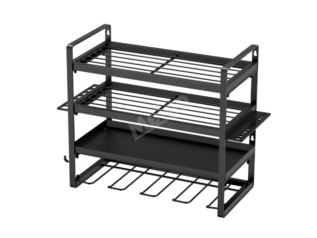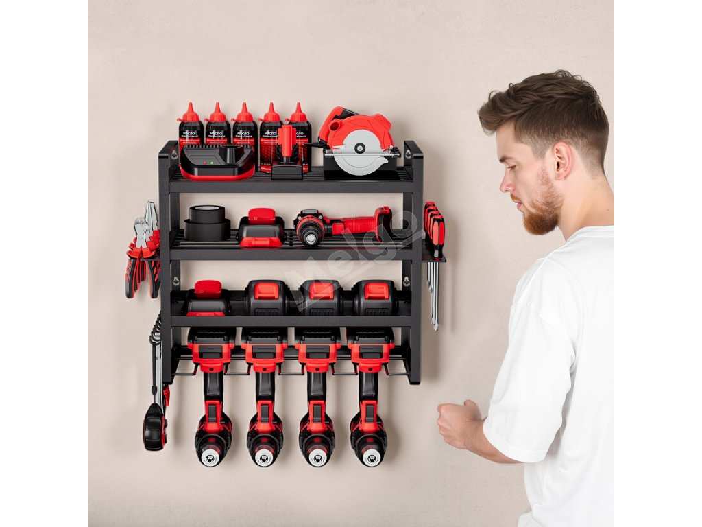 Vďaka viacúrovňovému usporiadaniu nástenného organizéra náradia je uchopenie správneho náradia hračkou - horná polica na batérie a nabíjačky, stredná na boxy s náradím a súčiastky, spodné otvory na vŕtačky alebo kladivá. Na bočných háčikoch sú prehľadne uložené kliešte, skrutkovače, kľúče a meracie pásky.