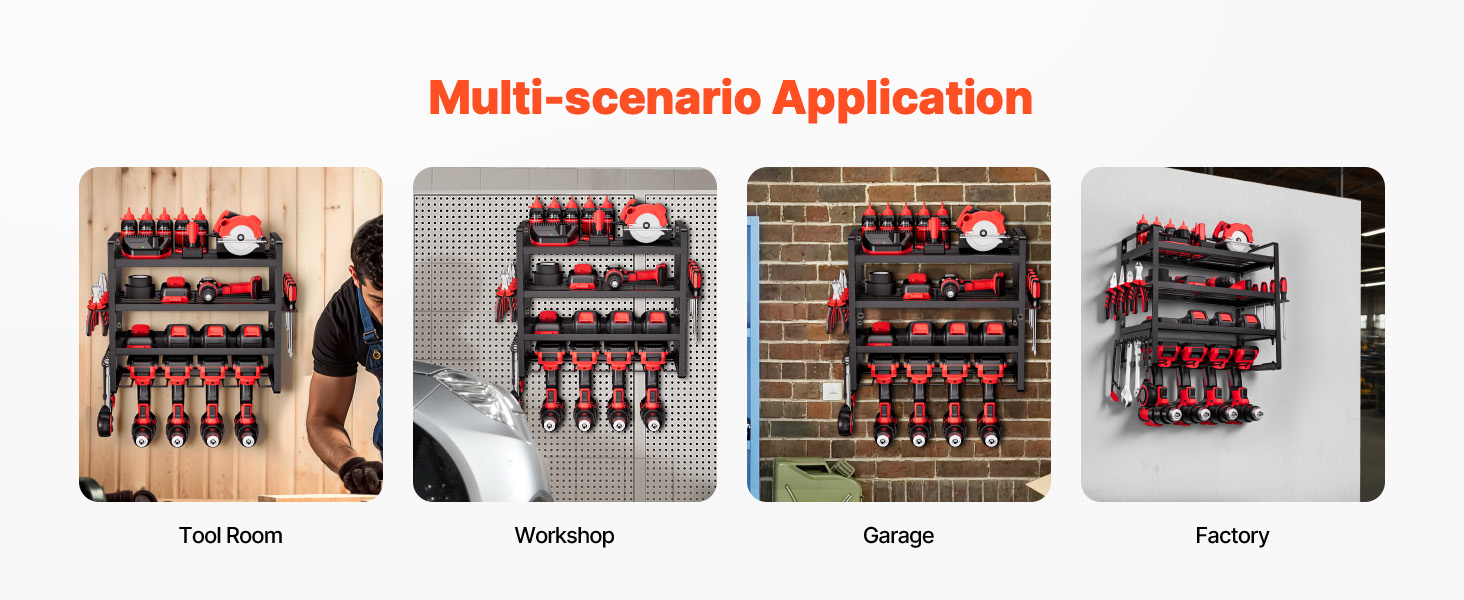 Tento stojan na uskladnenie elektrického náradia je vyrobený z vysokopevnostnej uhlíkovej ocele a odoláva ohýbaniu alebo deformácii. Povrchová úprava práškovou farbou zvyšuje odolnosť proti korózii, čím zaručuje dlhodobú životnosť a bezpečné uloženie všetkého náradia.