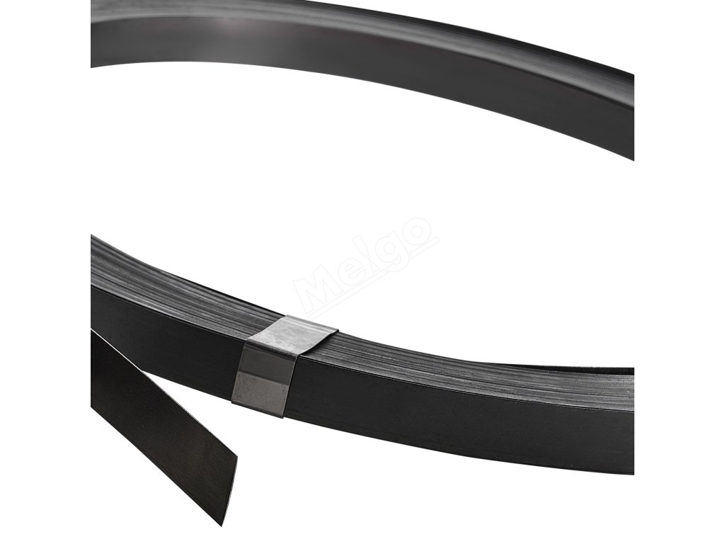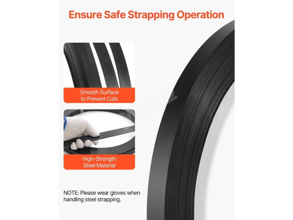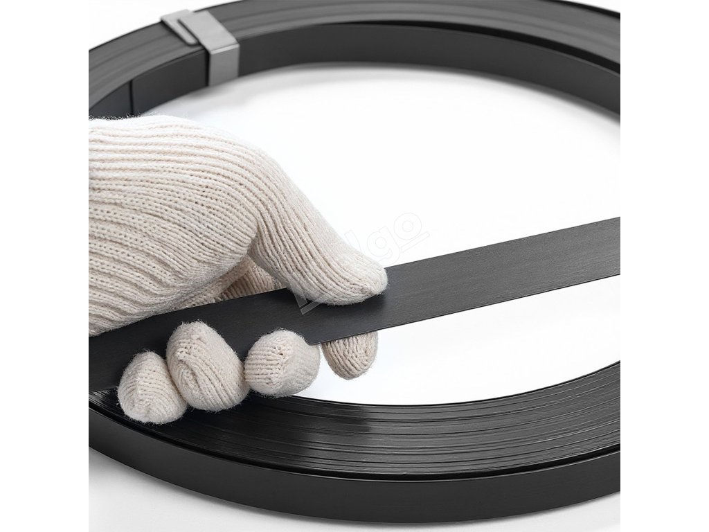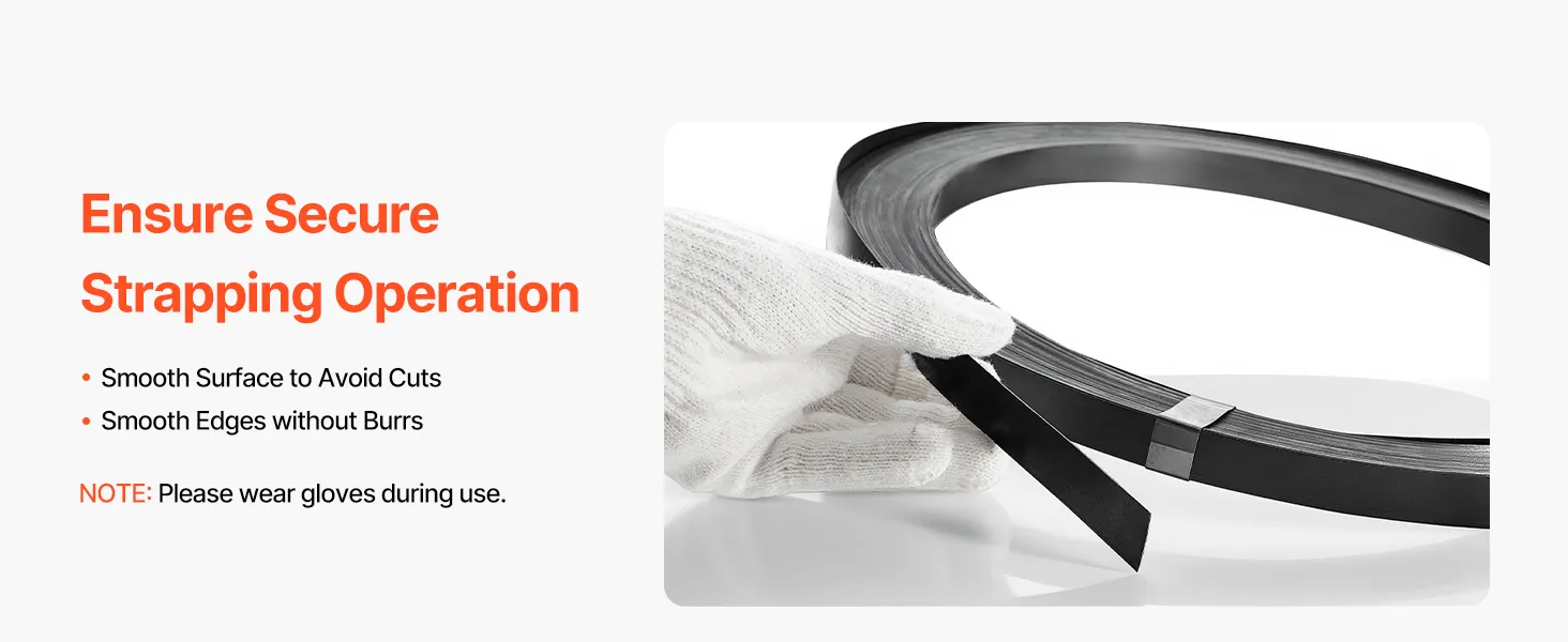 Vysokopevnostná oceľová páska s hladkým povrchom a bezpečnými okrajmi na zníženie poranení rúk a zvýšenie bezpečnosti páskovania (odporúča sa používať rukavice).
