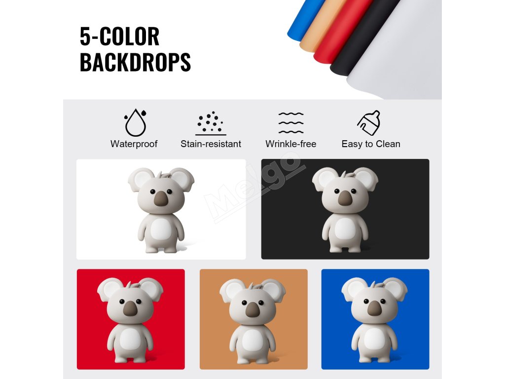 Zvýšte svoju kreativitu pomocou našich 5 odnímateľných pozadí (čierne/biele/oranžové/červené/modré). Bez námahy vytvárajte rôzne efekty pozadia a tematické štýly. Tieto pozadia sú vyrobené z vodoodolného PP materiálu, ľahko sa čistia, vymieňajú a sú odolné voči pokrčeniu, čím zvyšujú efektivitu vášho pracovného postupu.