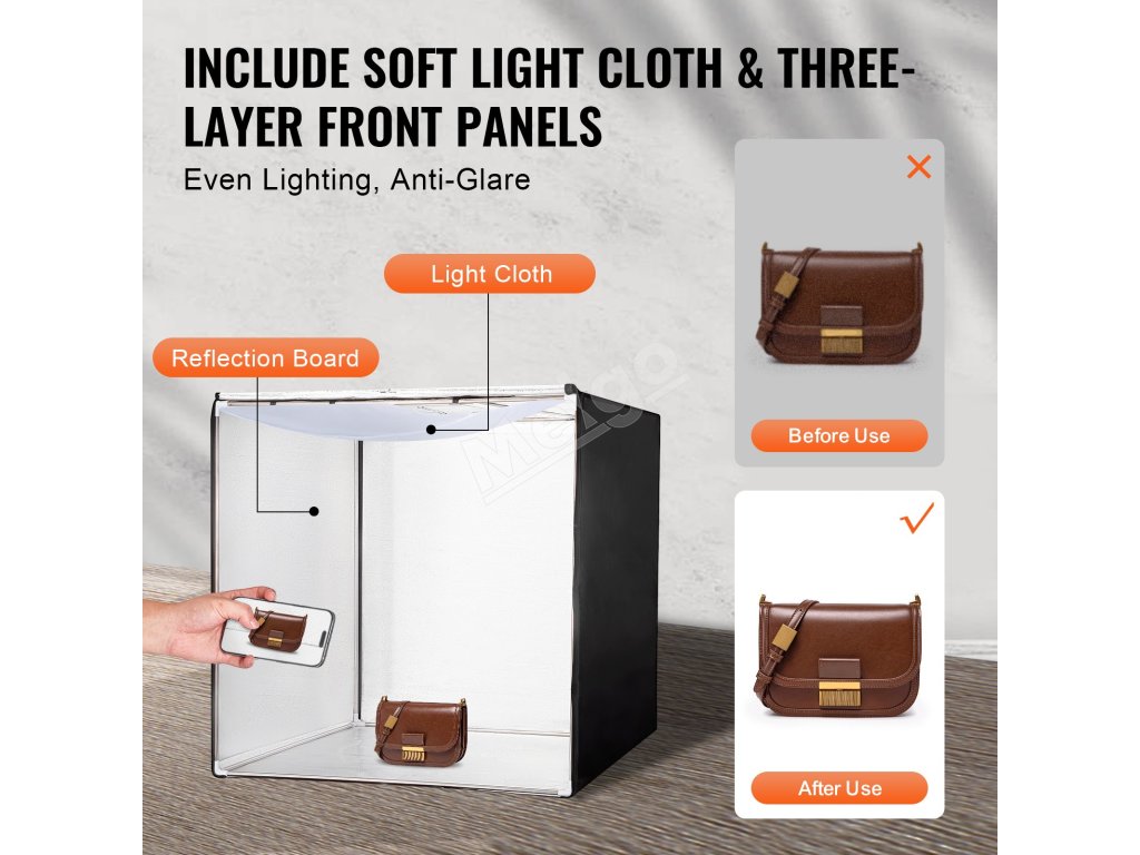 Zvýšte svoju fotografickú všestrannosť vďaka viacerým svetelným efektom a možnosti snímania z viacerých uhlov. Náš svetelný box pre fotografické štúdio vám umožní bez námahy zachytiť rôzne drobné výrobky.