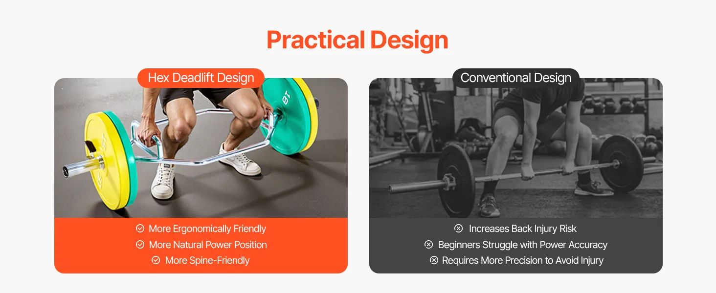 Šesťuholníkový dizajn mŕtveho ťahu je špeciálne vytvorený na zlepšenie držania tela pri zdvíhaní a ochranu chrbtice počas ťažkých zdvihov.