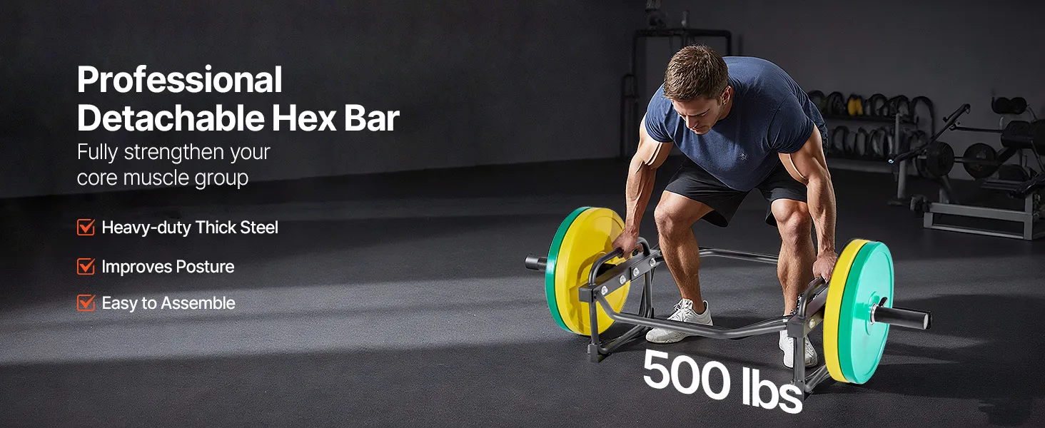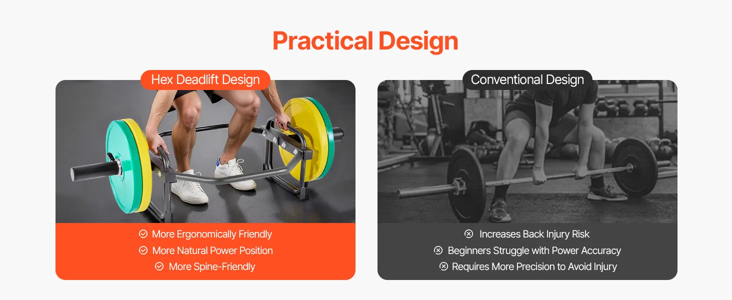 Šesťuholníkový dizajn mŕtveho ťahu je špeciálne vytvorený na zlepšenie držania tela pri zdvíhaní a ochranu chrbtice počas ťažkých zdvihov.