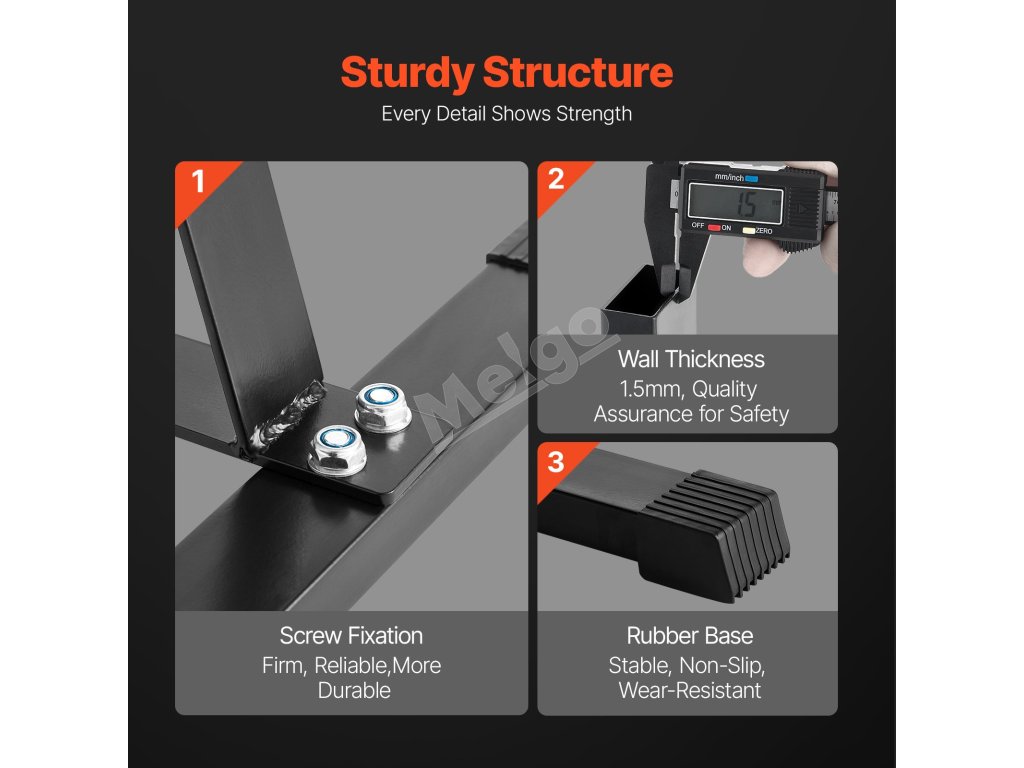 Vďaka použitiu technológie úplného zvárania sa tento stojan na skladovanie v domácej posilňovni vyznačuje bezšvovými spojmi, ktoré výrazne zvyšujú celkovú pevnosť a stabilitu konštrukcie. Vysokokvalitné materiály zaručujú odolnosť stojana.