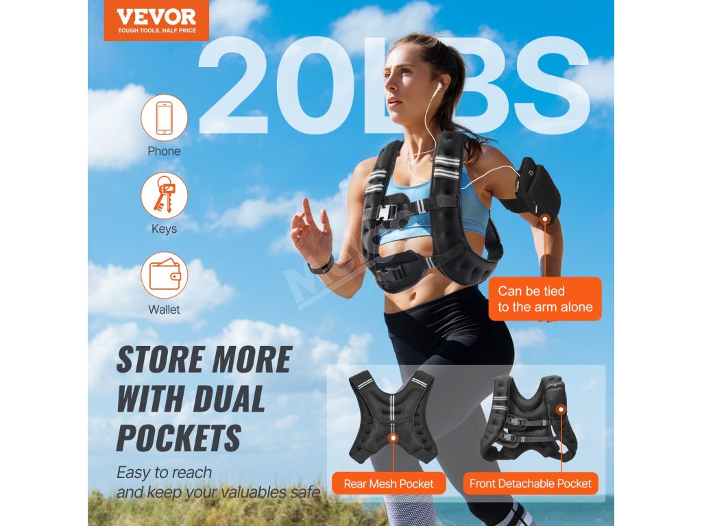 Táto záťažová vesta, vybavená predným odnímateľným vreckom a zadným sieťovaným vreckom, ponúka dostatok priestoru na uloženie vašich nevyhnutností. Počas tréningu môžete mať veci ako telefón, kľúče a peňaženku v bezpečí a prístupné.