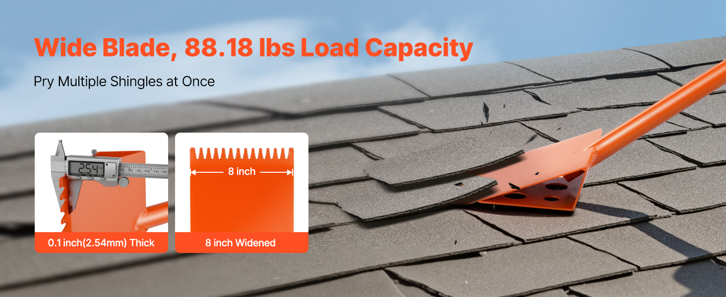 S 8-palcovým širokým a 0,1-palcovým hrubým čepeľom tento nástroj na odstraňovanie strešnej krytiny unesie až 88,18 libier, čo umožňuje čistiť viacero šindľov naraz. Šetrí čas a prácu, čím zvyšuje efektivitu pri demolačných prácach.