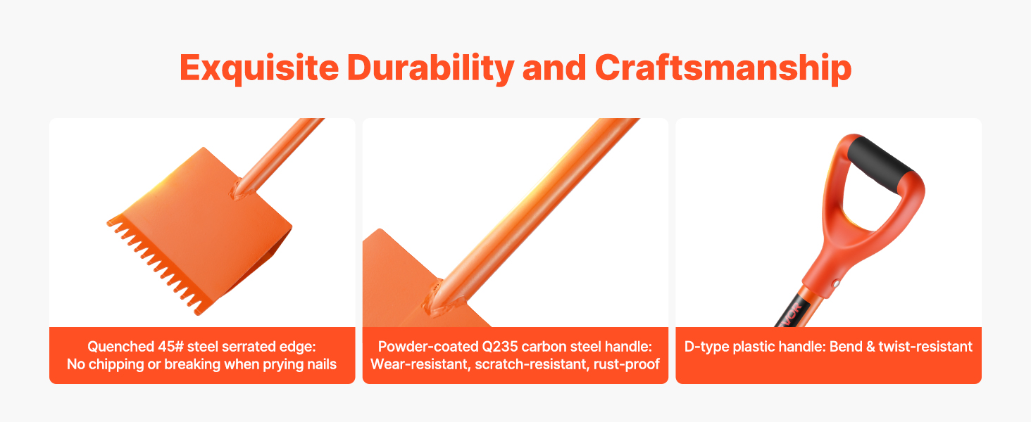 Čepeľ je vyrobená z tepelne spracovanej ocele 45#, čím sa zabraňuje odlupovaniu pri vyťahovaní klincov. Oceľová rukoväť je potiahnutá nástrekom pre robustné použitie, zatiaľ čo plastová rukoväť s D-úchopom zvyšuje odolnosť proti ohybu a krúteniu, čím zabezpečuje spoľahlivosť pri náročných úlohách.