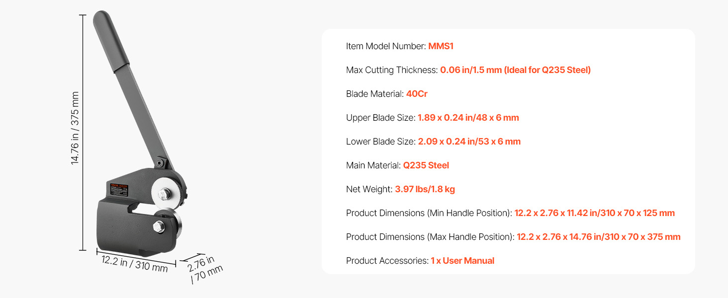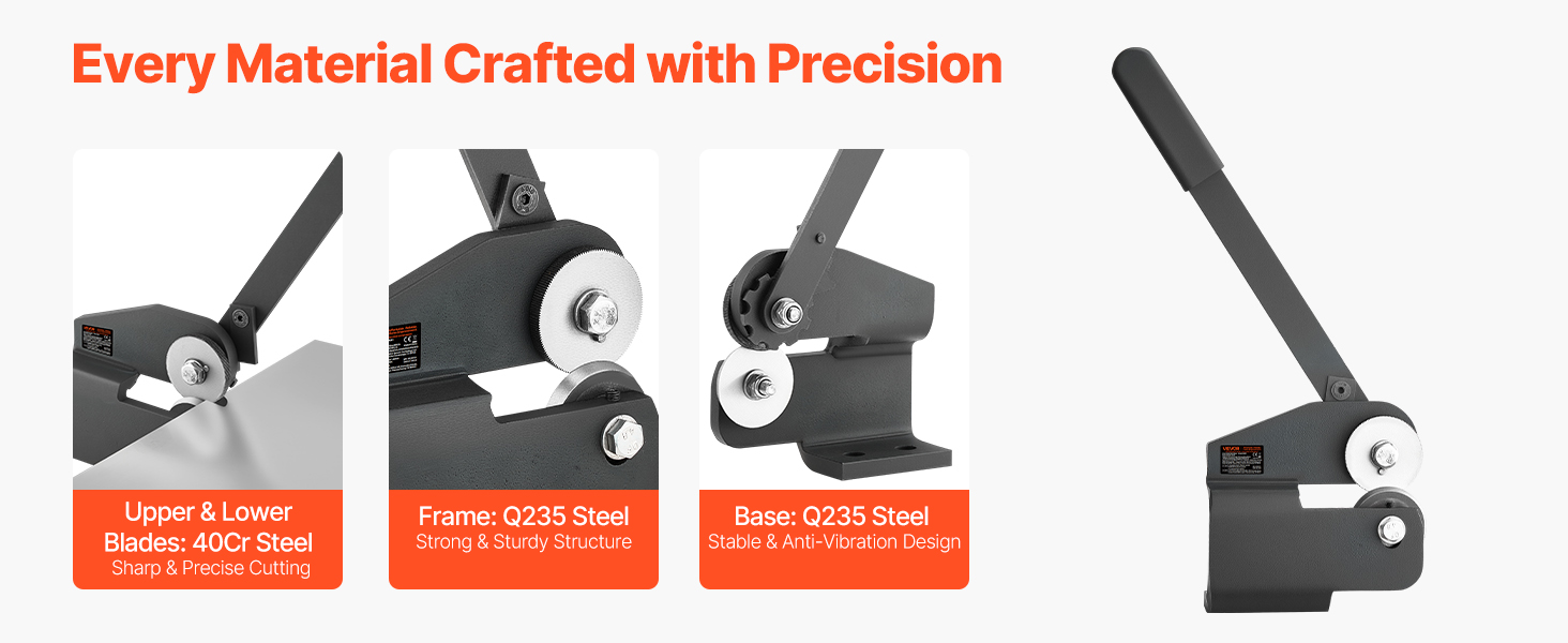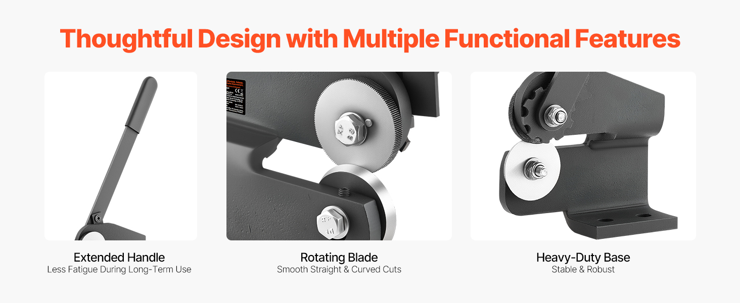 Tieto nožnice na plech sú ideálne na strihanie hliníka, nehrdzavejúcej ocele a nízkouhlíkovej ocele do rovných línií aj kriviek. Má čepele z ocele 40Cr s maximálnou hrúbkou rezu 0,07 palca. Medzera <0,07 mm zabezpečuje hladké rezy bez otrepov.