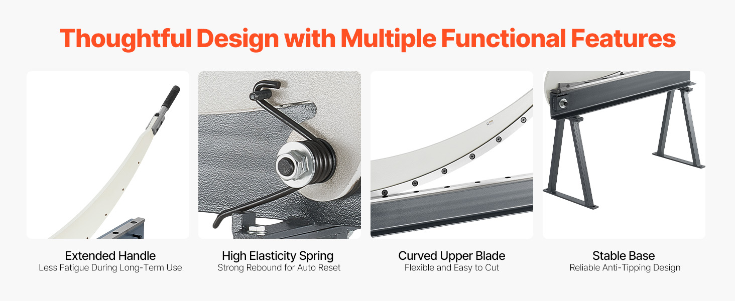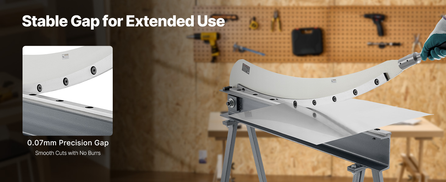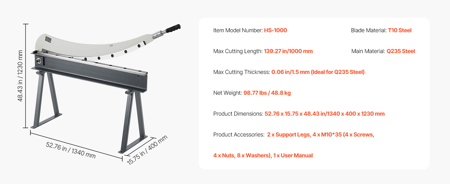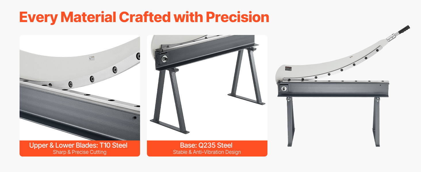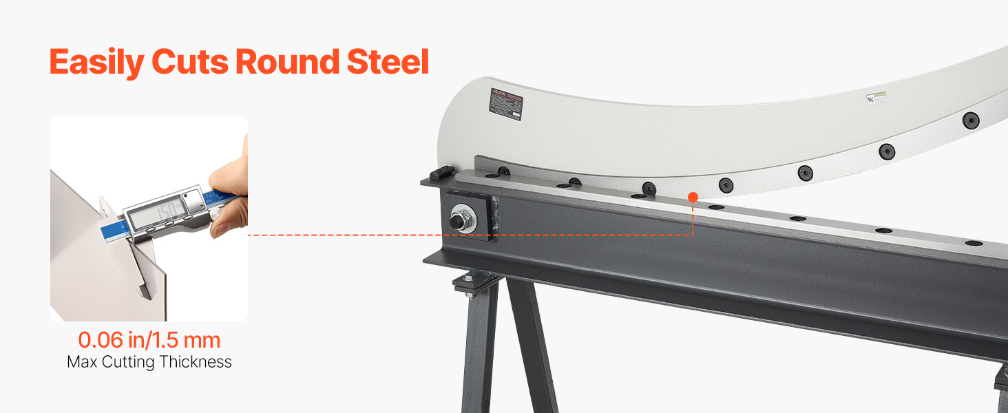 Tieto nožnice na plech sú ideálne na strihanie hliníka, nehrdzavejúcej ocele a nízkouhlíkovej ocele. Je vybavená nožmi z ocele T10 a kruhovým ostrím s maximálnou dĺžkou strihu 39,27 palca, hrúbkou 0,06 palca a kapacitou na kruhovú oceľ 0,06 palca. Medzera <0,07 mm zabezpečuje presné rezy bez otrepov.