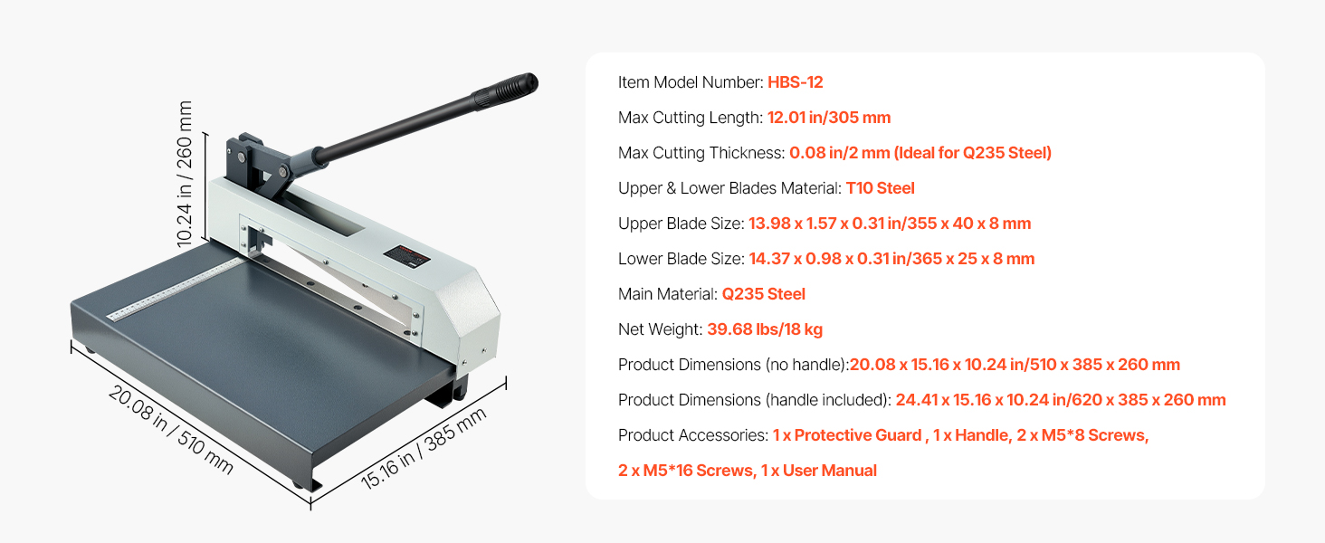 Tieto gilotínové nožnice na plech sú ideálne na strihanie hliníka, nehrdzavejúcej ocele a nízkouhlíkovej ocele. Je vybavená nožmi z ocele T10 a okrúhlym nožom s maximálnou dĺžkou strihu 12,01 palca, hrúbkou 0,08 palca a kapacitou na okrúhlu oceľ 0,08 palca. Medzera <0,07 mm zabezpečuje presné rezy bez otrepov.