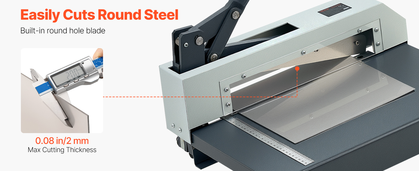 Viac ako len rezačka plechu. Tento stroj je vybavený špeciálne navrhnutým nožom s okrúhlymi otvormi, ktorý vám umožní ľahko rezať výstuže a iné okrúhle materiály. S maximálnym priemerom rezu 0,08 palca/2 mm je to univerzálny nástroj na použitie v dielni aj na stavenisku.