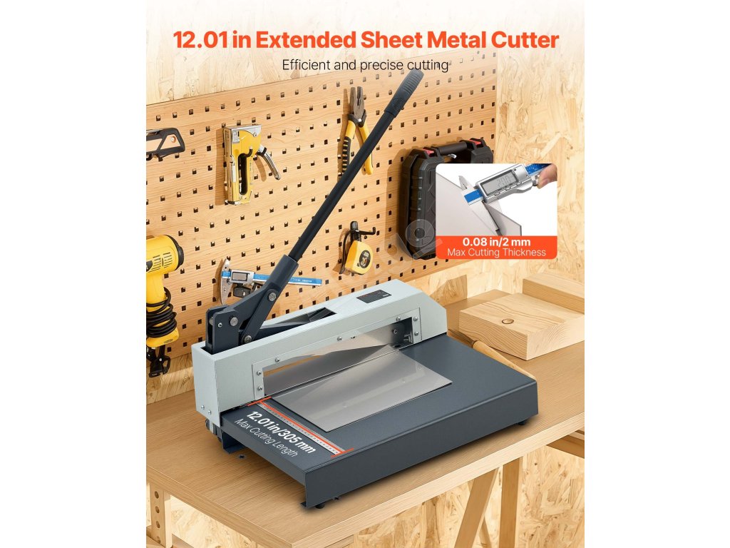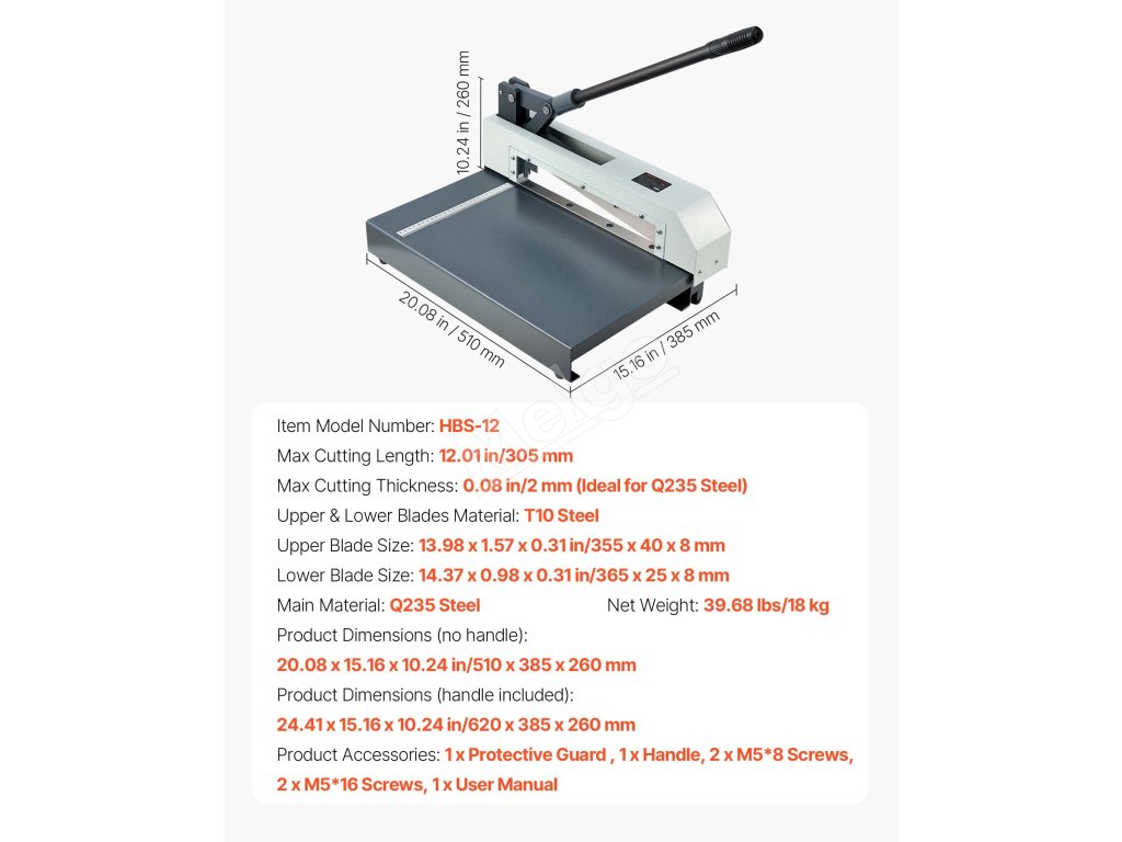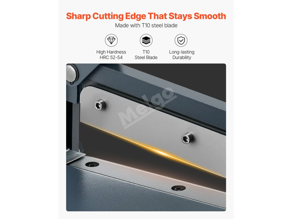 Tieto gilotínové nožnice na plech sú ideálne na strihanie hliníka, nehrdzavejúcej ocele a nízkouhlíkovej ocele. Je vybavená nožmi z ocele T10 a okrúhlym nožom s maximálnou dĺžkou strihu 12,01 palca, hrúbkou 0,08 palca a kapacitou na okrúhlu oceľ 0,08 palca. Medzera <0,07 mm zabezpečuje presné rezy bez otrepov.
