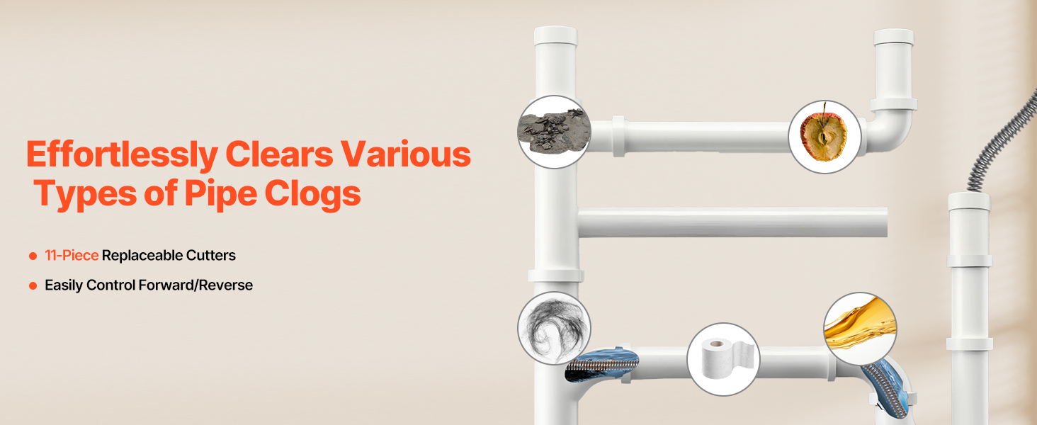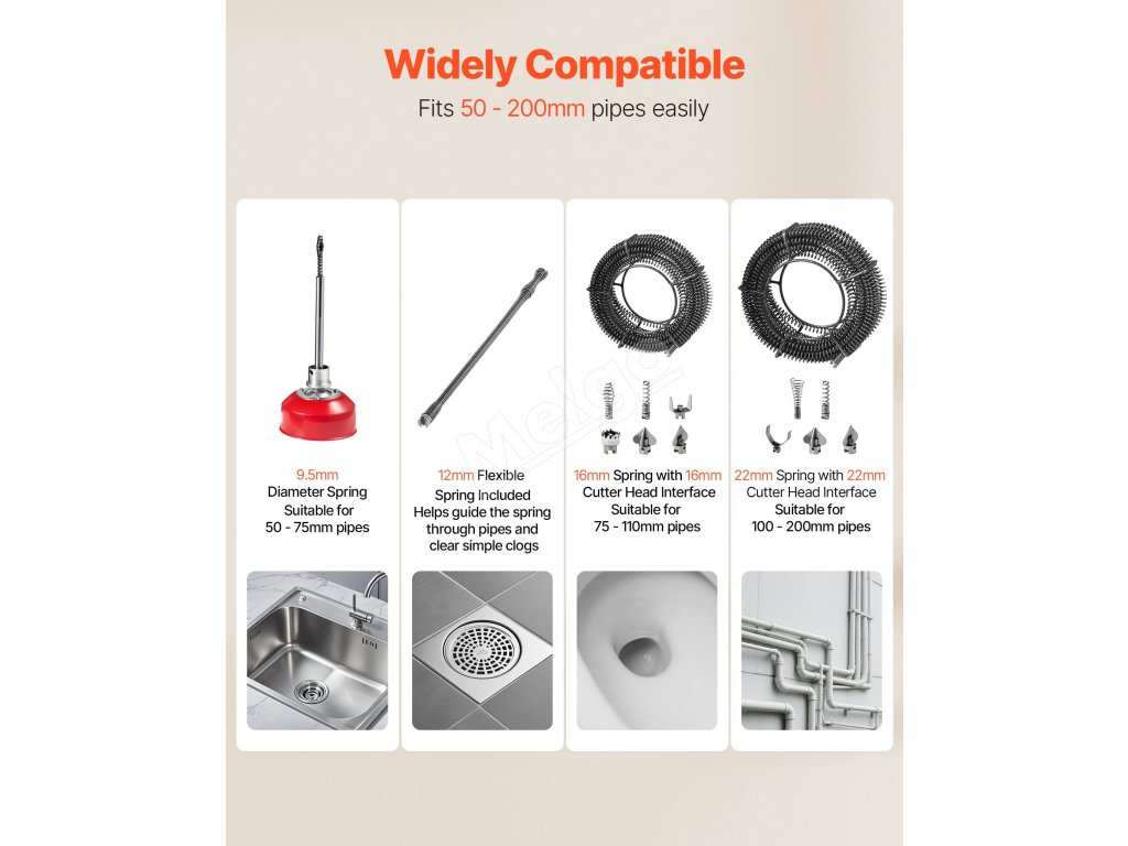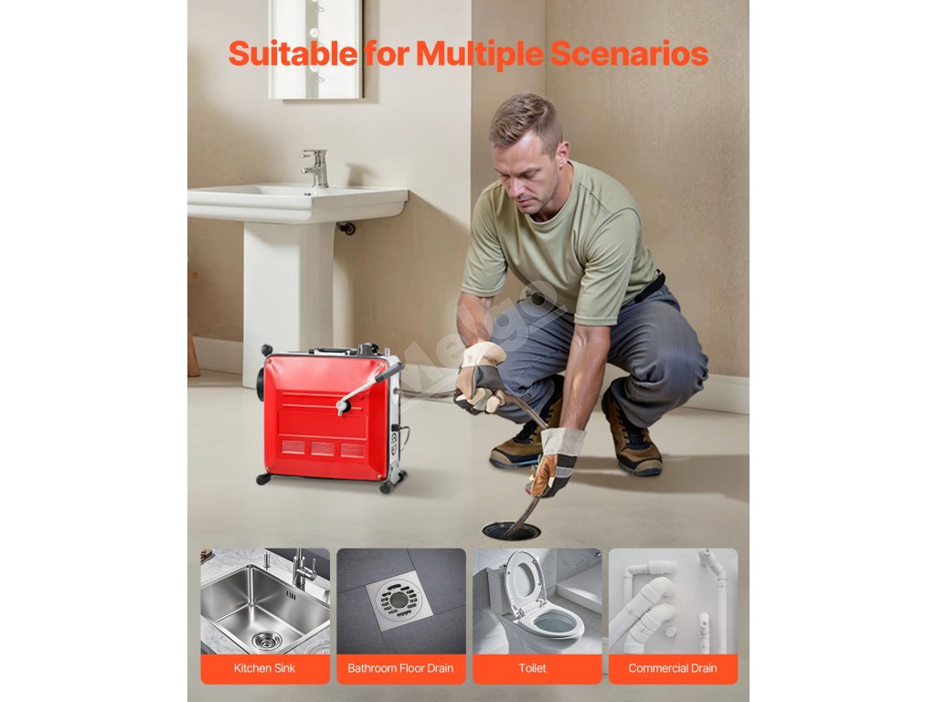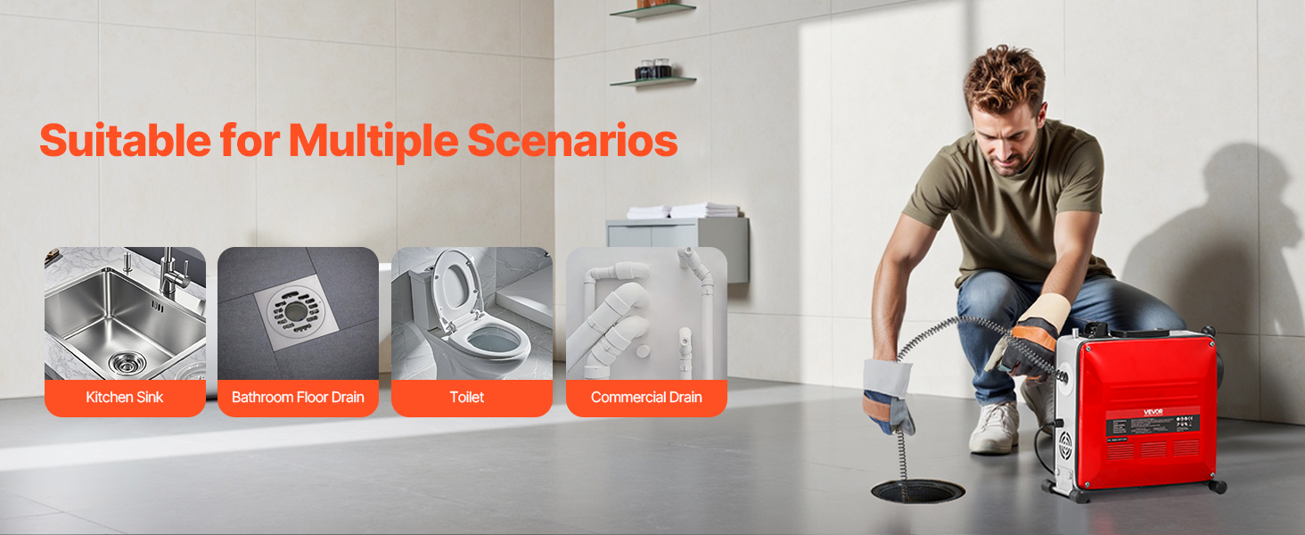 Či už ide o umývadlá, sprchy, kanalizáciu, toalety, kúpeľne, kuchyne, podlahové odtoky alebo komerčné vodovodné potrubia, stroj na čistenie kanalizácie VEVOR ponúka univerzálne riešenia, ktoré spĺňajú širokú škálu potrieb v oblasti čistenia.