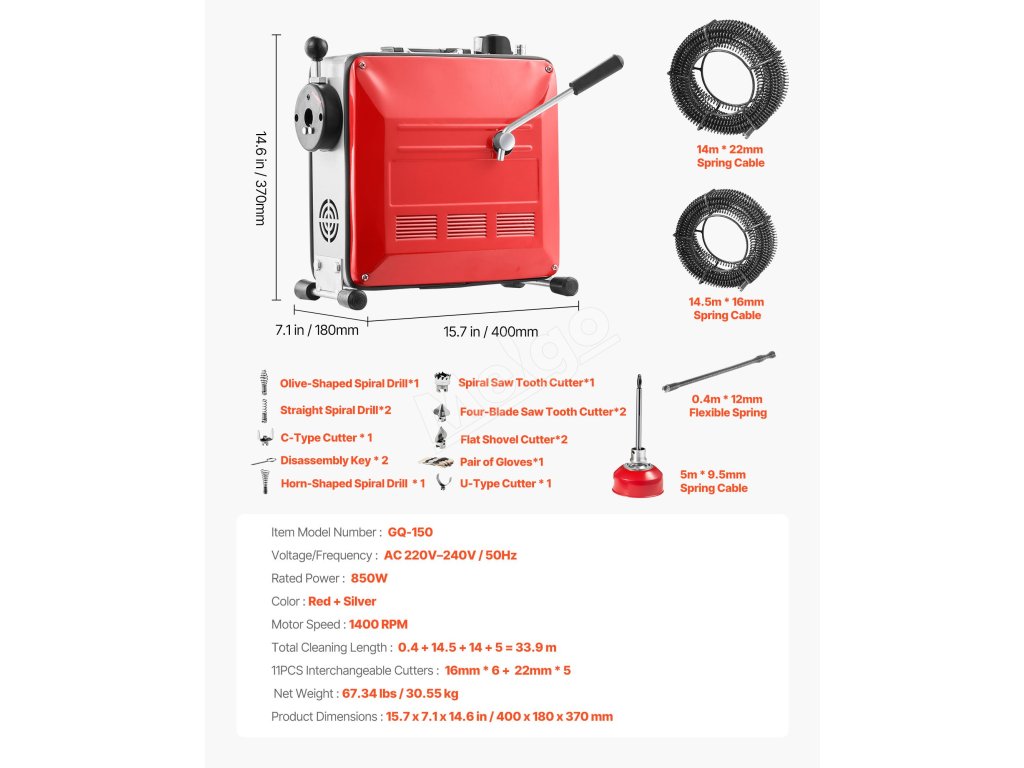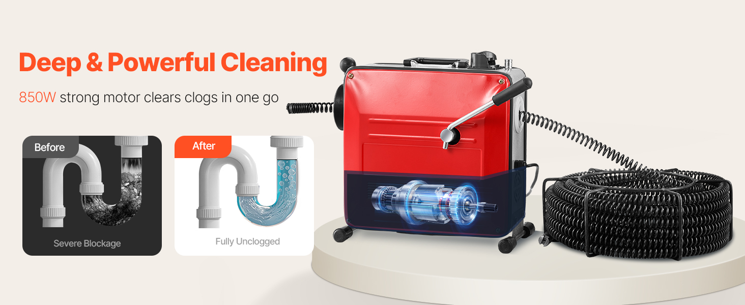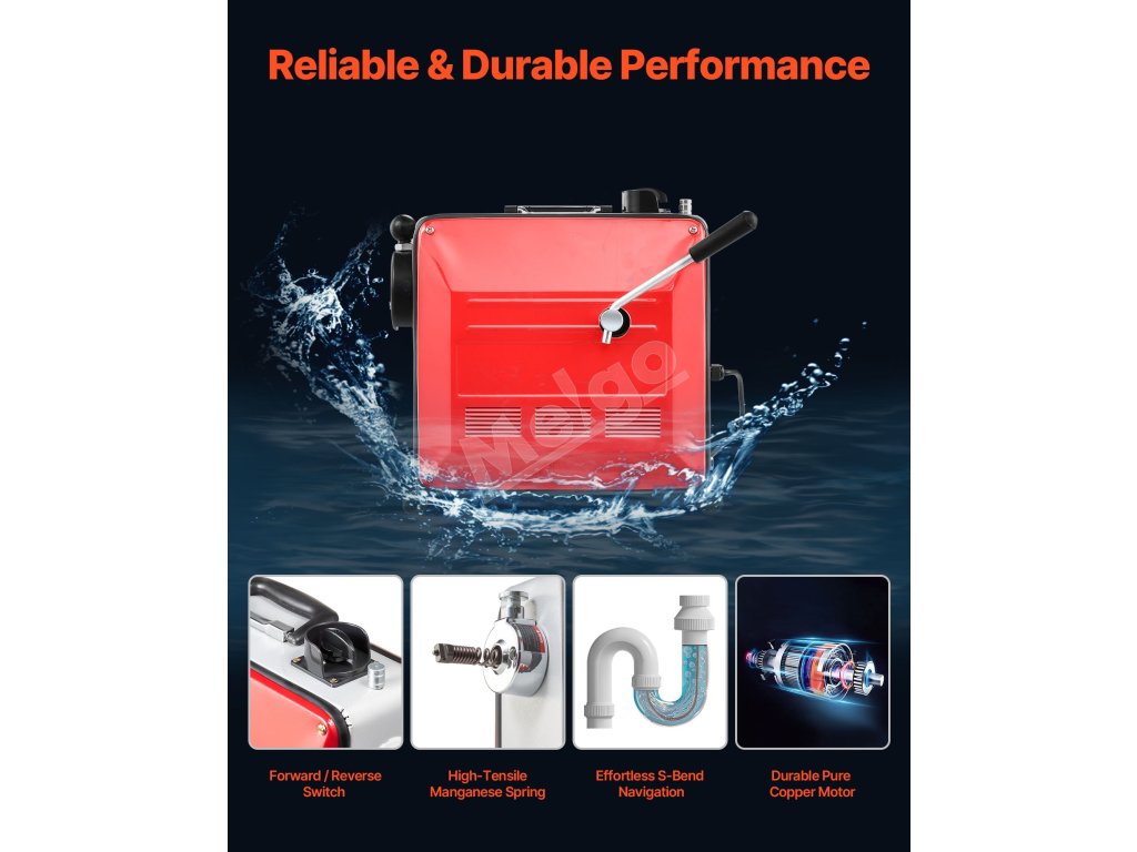 Tento čistič potrubia je poháňaný motorom s výkonom 850 W a otáčkami 1400 ot/min, ktorý poskytuje silný a stabilný výkon na prekonanie upchania. Vysoká rýchlosť otáčania a efektívny výkon zabezpečujú hlboké a dôkladné čistenie.