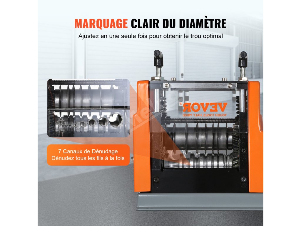 Má 7 oddeľovacích otvorov vrátane 6 okrúhlych kanálov a 1 plochého otvoru. Nastavte si čepeľ tak, aby sa zmestili všetky vodiče s priemerom od 0,06'' do 0,98''.