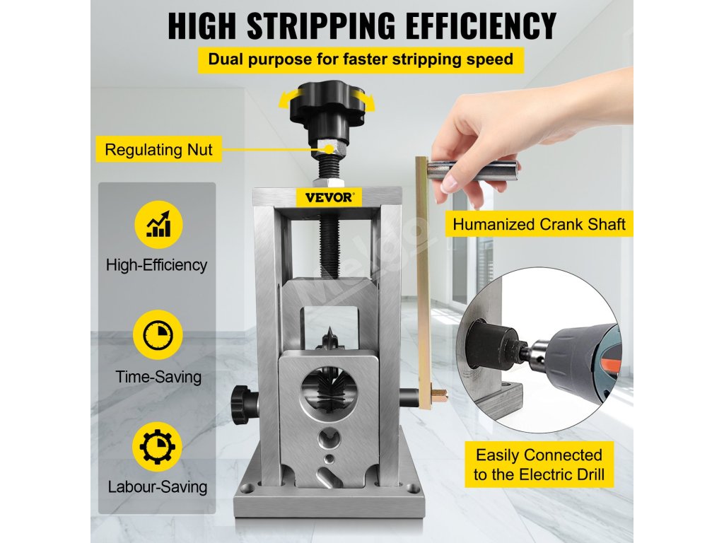 Tento stroj na odizolovanie drôtov, navrhnutý s voliteľným výkonom poháňaným vŕtačkou, je oveľa úspornejší a efektívnejší ako tradičné odizolovače drôtov.