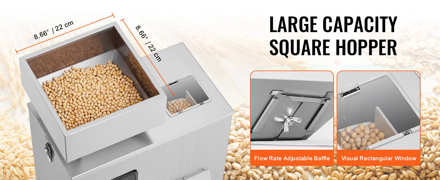 Náš stroj na plnenie granúl je vybavený priehľadným okienkom na hornej strane, takže môžete sledovať operácie a predchádzať prípadnému zaseknutiu. Zásobník z nehrdzavejúcej ocele 304 zaisťuje bezpečnosť potravín a zároveň poskytuje dostatočnú kapacitu. Nastaviteľné priehradky vám navyše umožňujú bez námahy regulovať prietok.