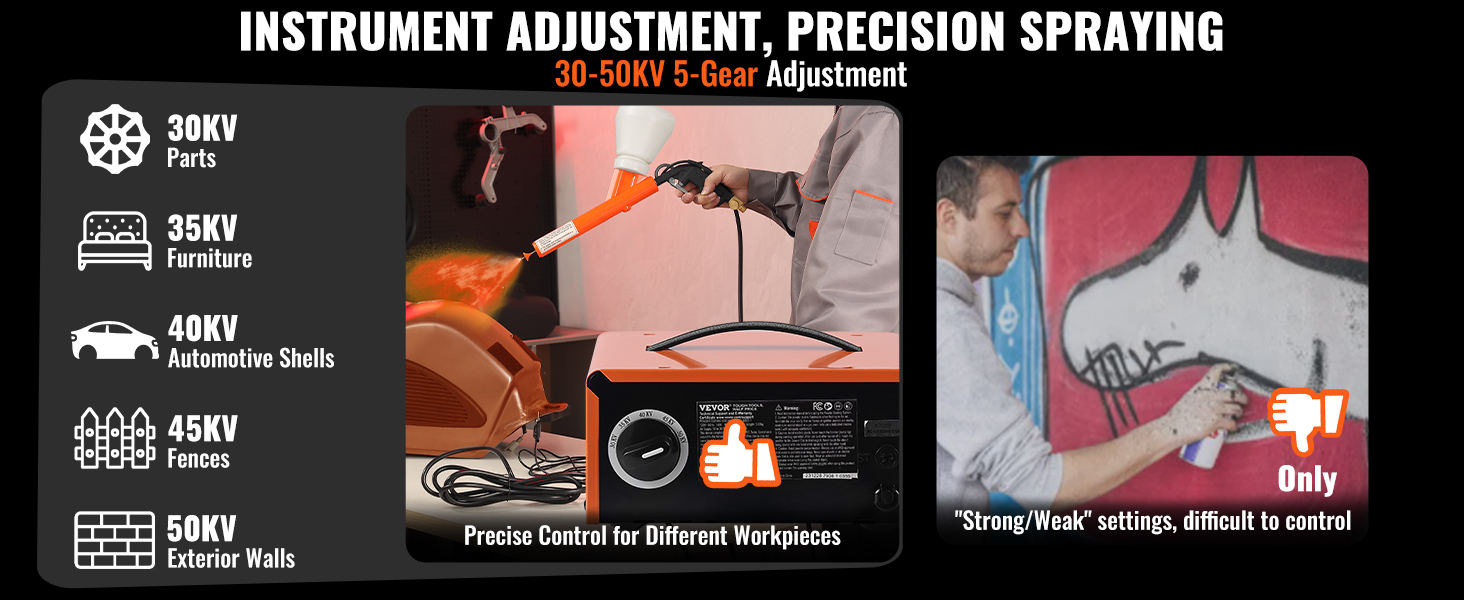Prispôsobte si práškové lakovanie pre rôzne obrobky nastavením napätia na (30/35/40/45/50)KV s 5 nastaveniami rýchlosti. V porovnaní s bežnými výrobkami s nastavením len "silný/slabý" poskytuje naša pištoľ na nanášanie práškových farieb presnejšiu a rovnomernejšiu kontrolu počas procesu nanášania povlaku.