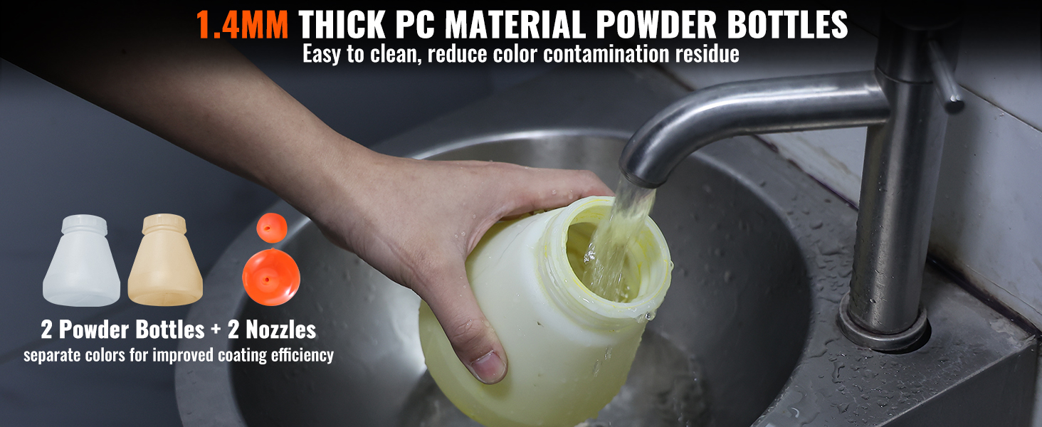 Naše zariadenie na práškové lakovanie sa ľahko čistí a obsahuje 2 fľaše s práškom a 2 trysky na samostatné skladovanie rôznych farieb. Pri zmene farieb na nanášanie náteru nie je potrebné čistenie medzi prepínaním farieb, čím sa znižuje riziko kontaminácie farieb a zvyšuje sa efektivita práce.